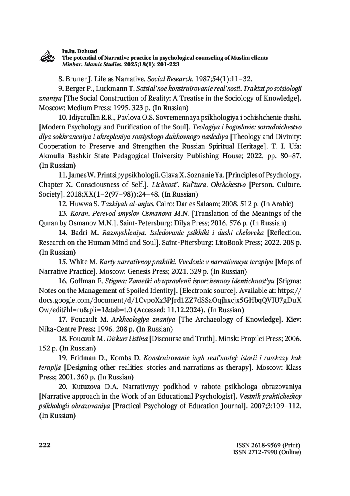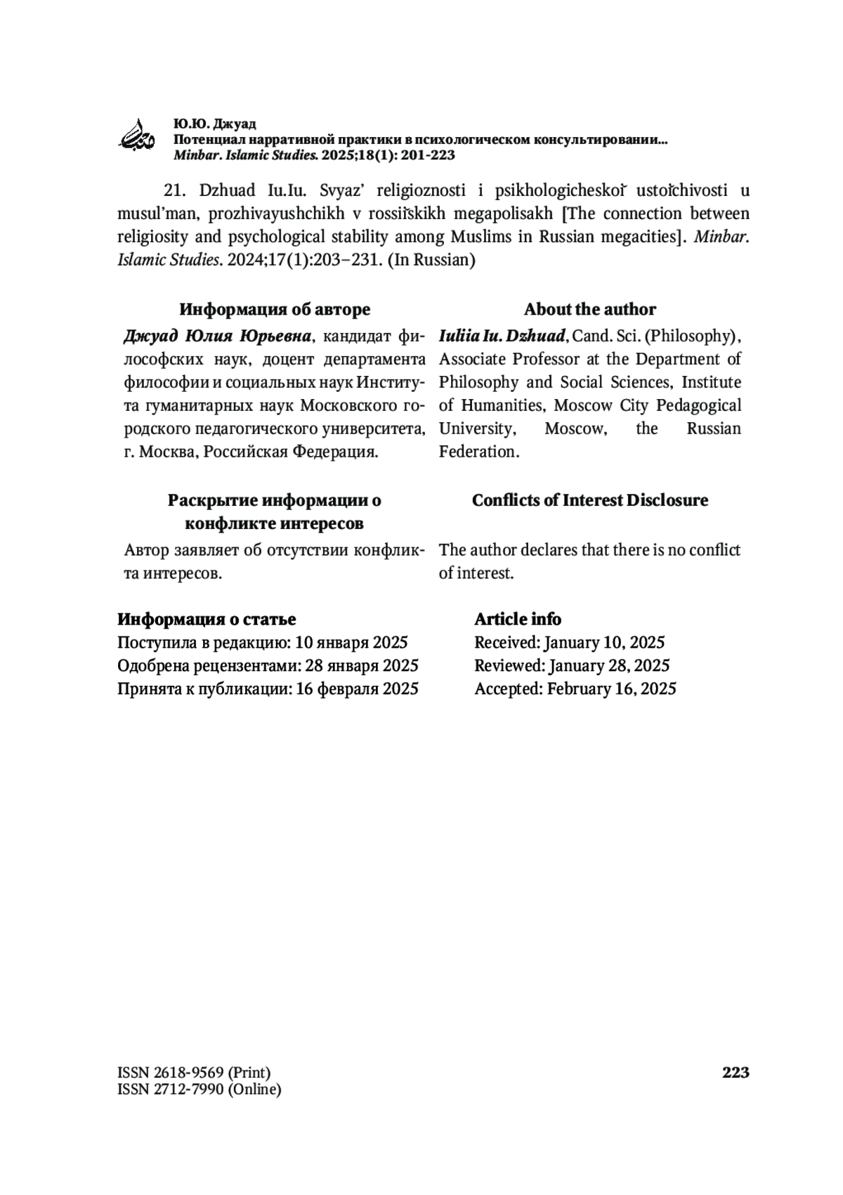21. Джуад Ю.Ю. Связь религиозности и психологической устойчивости у мусульман, проживающих в российских мегаполисах. Minbar. Islamic Studies. 2024;17(1):203-231.