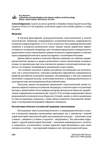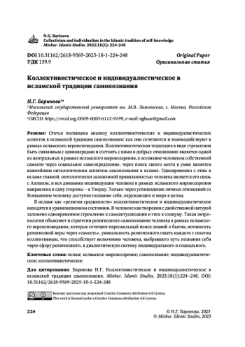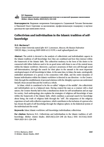 Статья посвящена анализу коллективистических и индивидуалистических аспектов в исламской традиции самопознания: как они сочетаются и взаимодействуют в рамках исламского вероисповедания. Коллективистическая тенденция в виде стремления быть связанным с единоверцами и состоять с ними в добрых отношениях является одной из центральных в рамках исламского мировоззрения, а осознание человеком собственной самости через социальное самоопределение, через поиск своего места в умме является важнейшим онтологическим аспектом самопознания в исламе. Одновременно с этим в исламе главной, онтологически заложенной привязанностью человека является его связь с Аллахом, и вся динамика индивидуации человека в рамках исламского мировоззрения направлена в одну стороны – к Творцу. Только через установление личных отношений со Всевышним человеку доступно познание себя, окружающих и мира в целом.