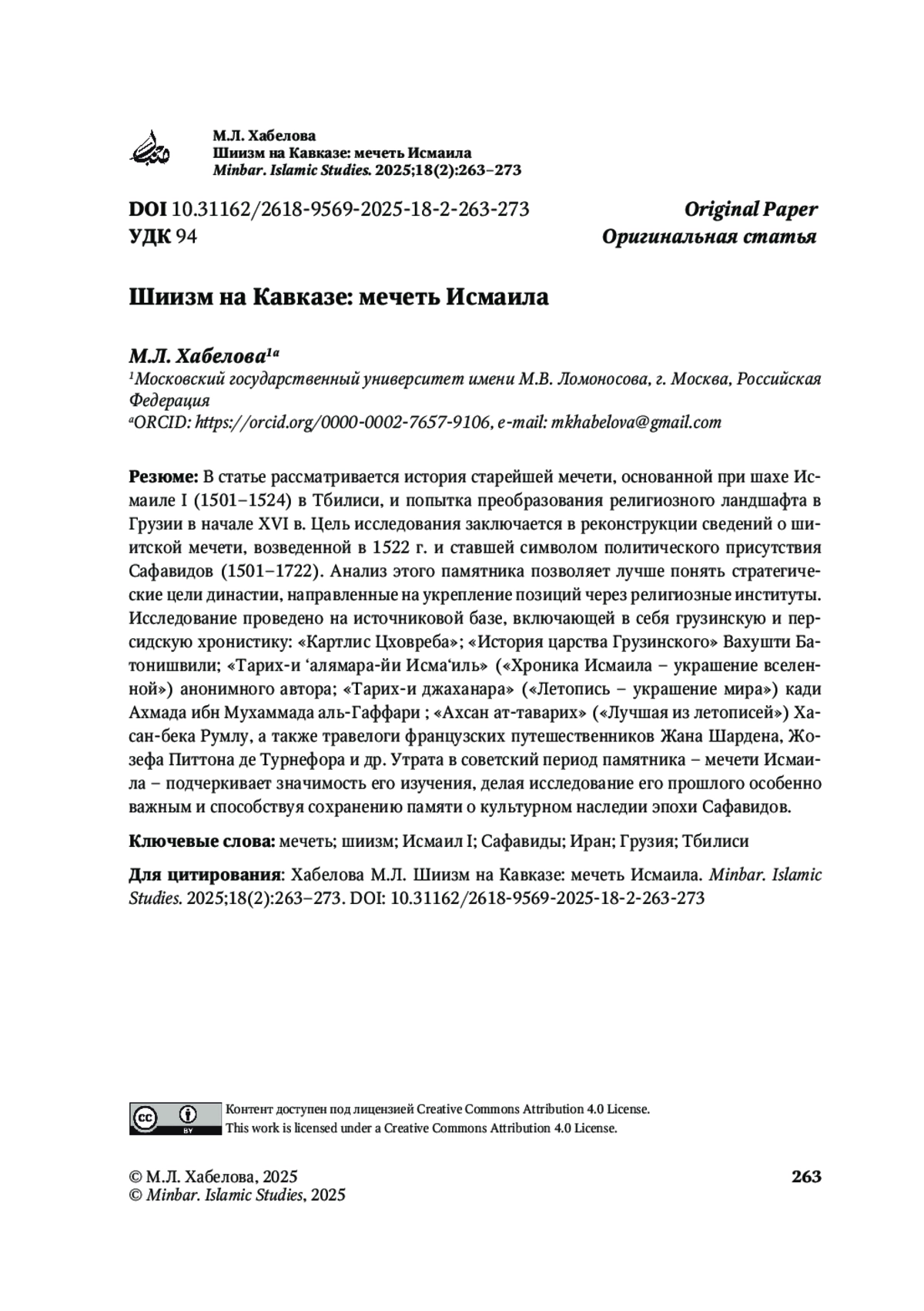 Цель исследования заключается в реконструкции сведений о шиитской мечети, возведенной в 1522 г. и ставшей символом политического присутствия Сафавидов (1501–1722).