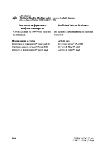 7. Мухаммад ибн ʻАбд-Аллах ат-Табризи. Мишкят аль-масабих. ʻАбд-аль-Хамид Хандави (ред.). Т. 1. Бейрут: аль-Мактаба аль-ʻАсриййа; 2008. 497 с.