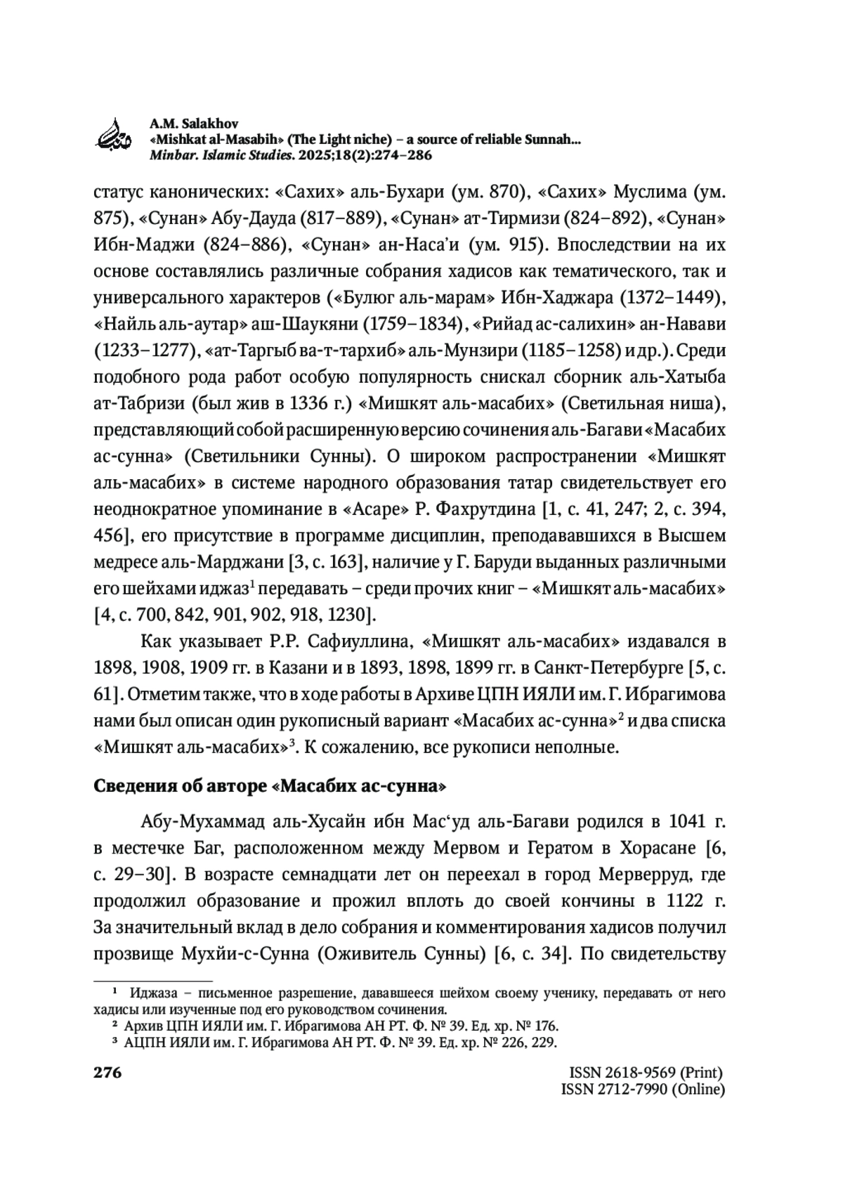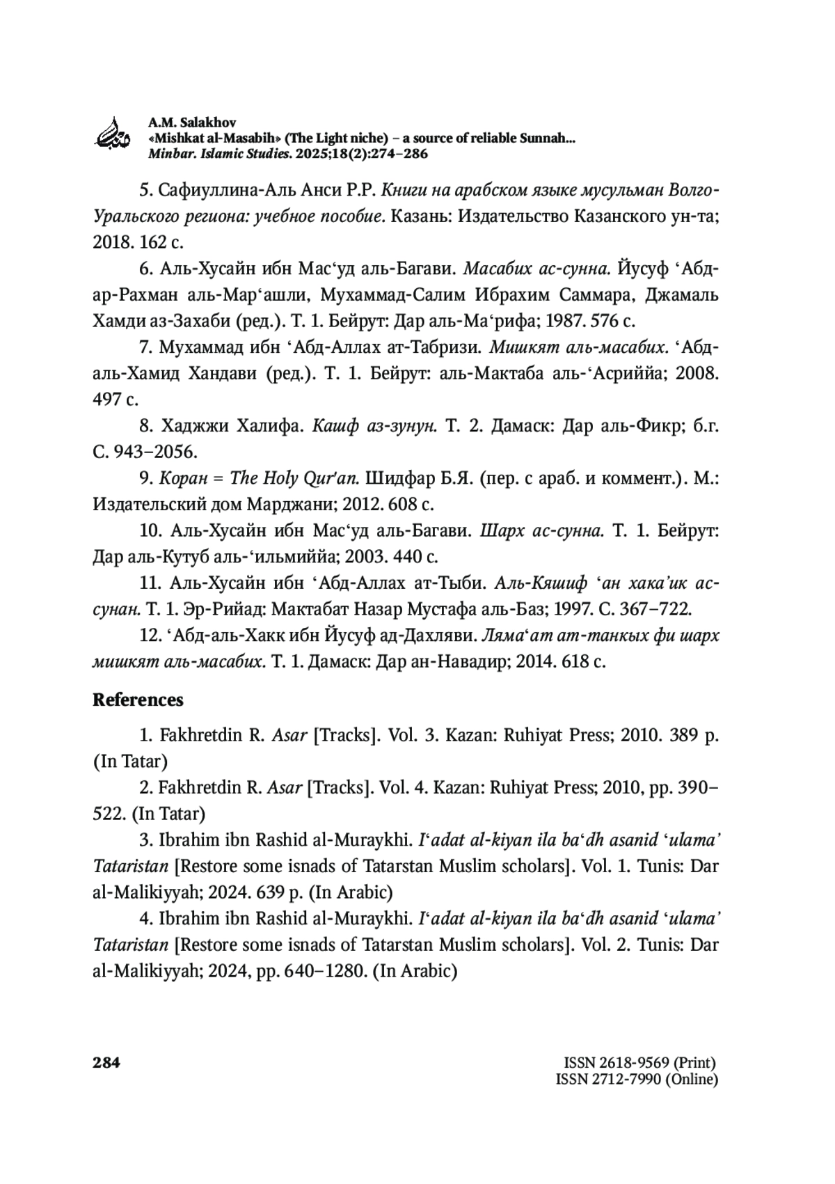 4. Ибрахим ибн Рашид аль-Мурайхы. Иʻадат аль-кийан иля баʻд асанид ʻулямаʼ Татаристан. Т. 2. Тунис: Дар аль-Маликиййа; 2024. С. 640-1280.