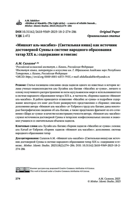 Статья посвящена описанию свода хадисов одного из известных в истории ислама ученых-энциклопедистов аль-Хусайна аль-Багави «Масабих ас-сунна», легшего в основу получившего распространение во всем мусульманском мире и использовавшегося в системе народного образования татар в XIX в., в частности сборника хадисов «Мишкят аль-масабих». В работе приводится оглавление «Масабих ас-сунна» и подробное содержание некоторых его книг для более развернутого представления о сборнике; описаны дополнения автора «Мишкят аль-масабих» ат-Табризи к труду аль-Багави; даны некоторые биографические сведения об аль-Багави, а также представлен фрагмент из его сочинения «Шарх ас-сунна» в качестве иллюстрации учености автора. «Мишкят аль-масабих» служил источником достоверной Сунны в татарских конфессиональных школах и знакомил учащихся со значительным объемом хадисов.