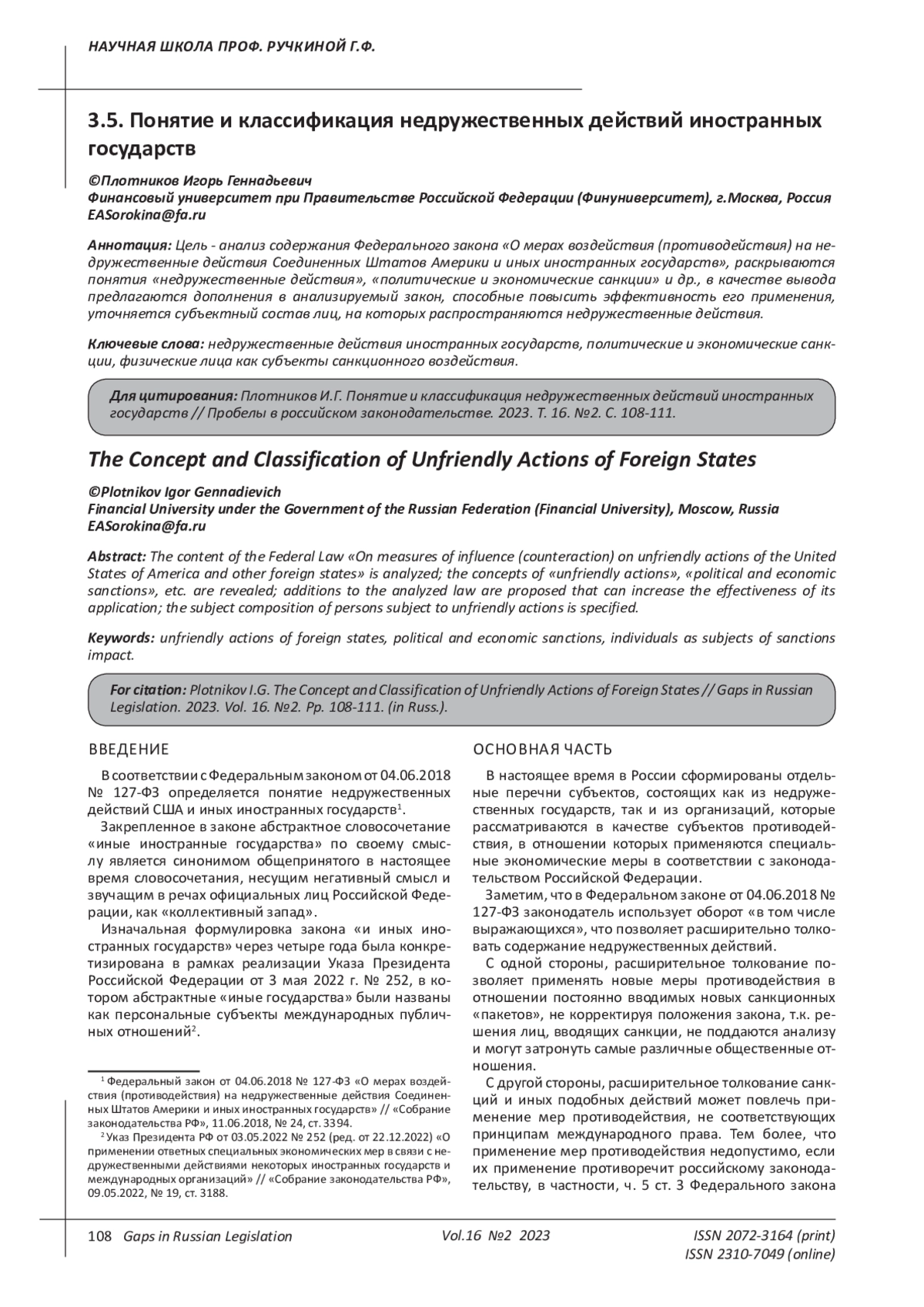 Цель - анализ содержания Федерального закона «О мерах воздействия (противодействия) на недружественные действия Соединенных Штатов Америки и иных иностранных государств», раскрываются понятия «недружественные действия», «политические и экономические санкции» и др., в качестве вывода предлагаются дополнения в анализируемый закон, способные повысить эффективность его применения, уточняется субъектный состав лиц, на которых распространяются недружественные действия.