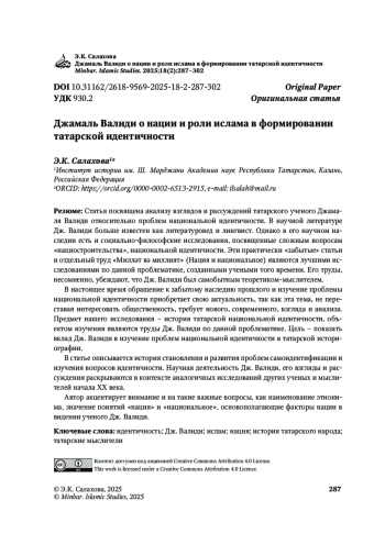 Статья посвящена анализу взглядов и рассуждений татарского ученого Джамаля Валиди относительно проблем национальной идентичности. В научной литературе Дж. Валиди больше известен как литературовед и лингвист. Однако в его научном наследии есть и социально-философские исследования, посвященные сложным вопросам «нациостроительства», национальной идентичности. Эти практически «забытые» статьи и отдельный труд «Милләт вә миллият» (Нация и национальное) являются лучшими исследованиями по данной проблематике, созданными учеными того времени. Его труды, несомненно, убеждают, что Дж. Валиди был самобытным теоретиком-мыслителем. В настоящее время обращение к забытому наследию прошлого и изучение проблемы национальной идентичности приобретают свою актуальность, так как эта тема, не переставая интересовать общественность, требует нового, современного, взгляда и анализа.