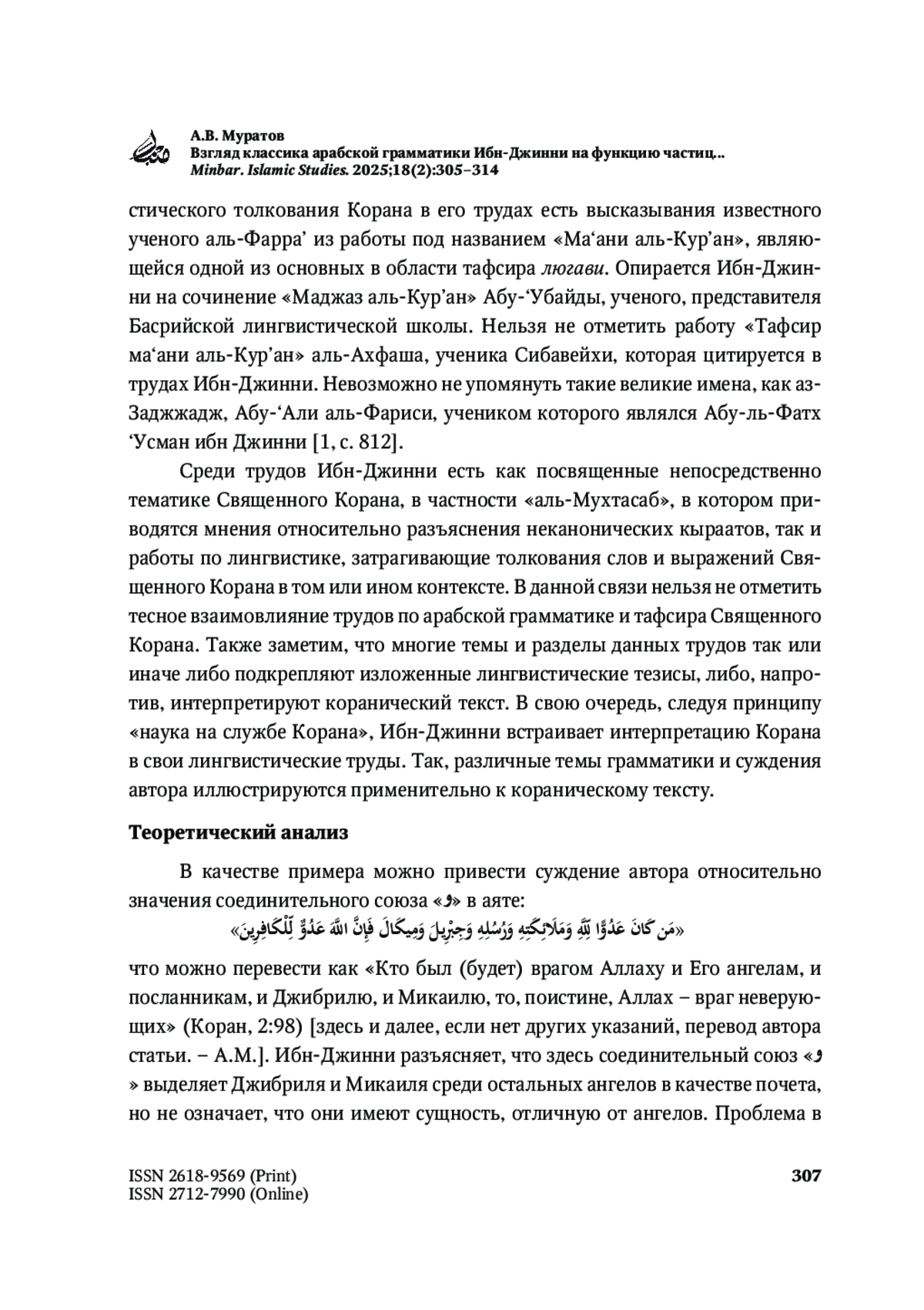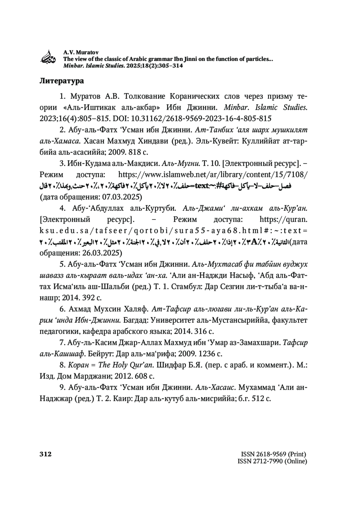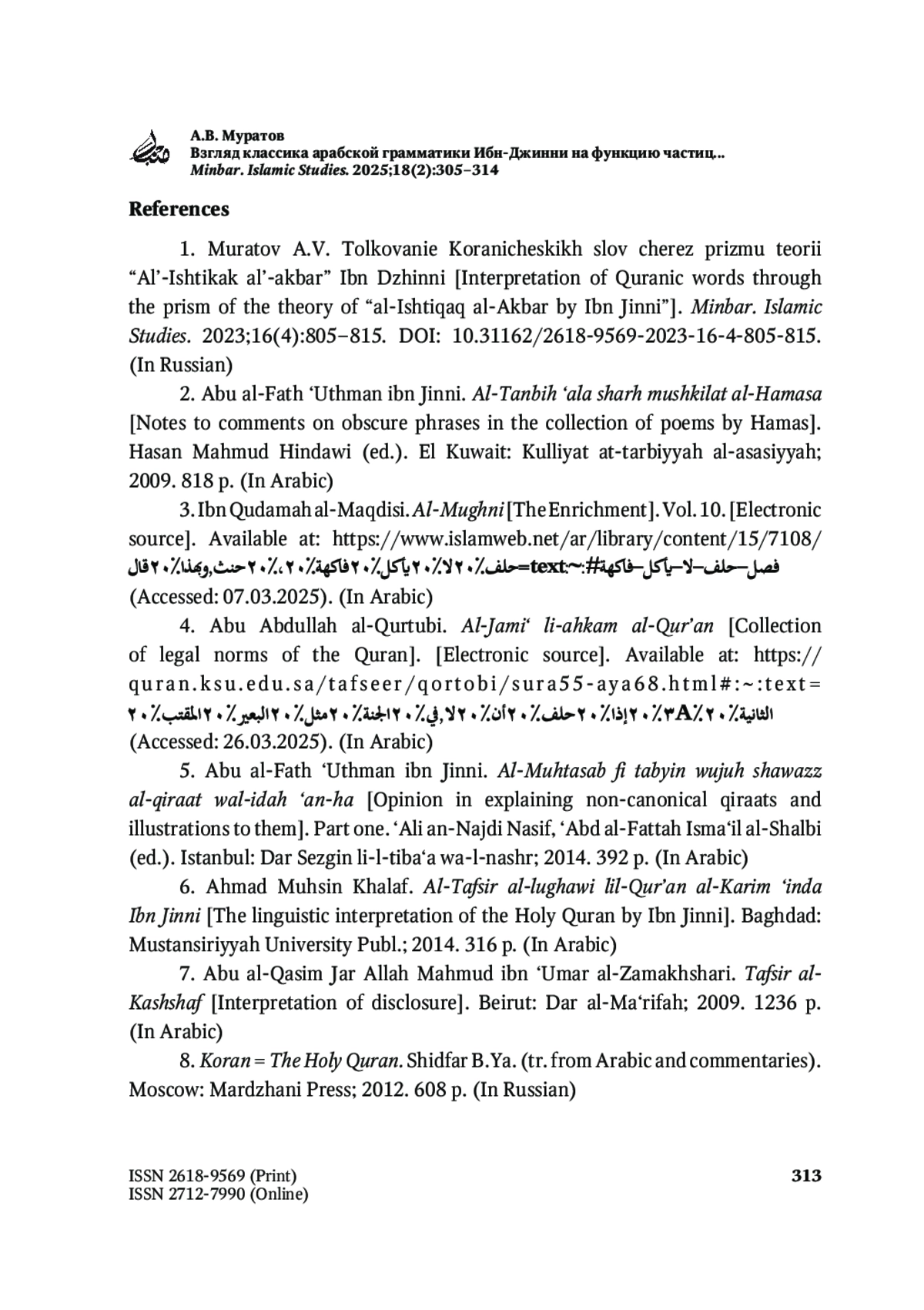 1. Муратов А.В. Толкование Коранических слов через призму теории «Аль-Иштикак аль-акбар» Ибн Джинни. Minbar. Islamic Studies. 2023;16(4):805-815. https://doi.org/10.31162/2618-9569-2023-16-4-805-815