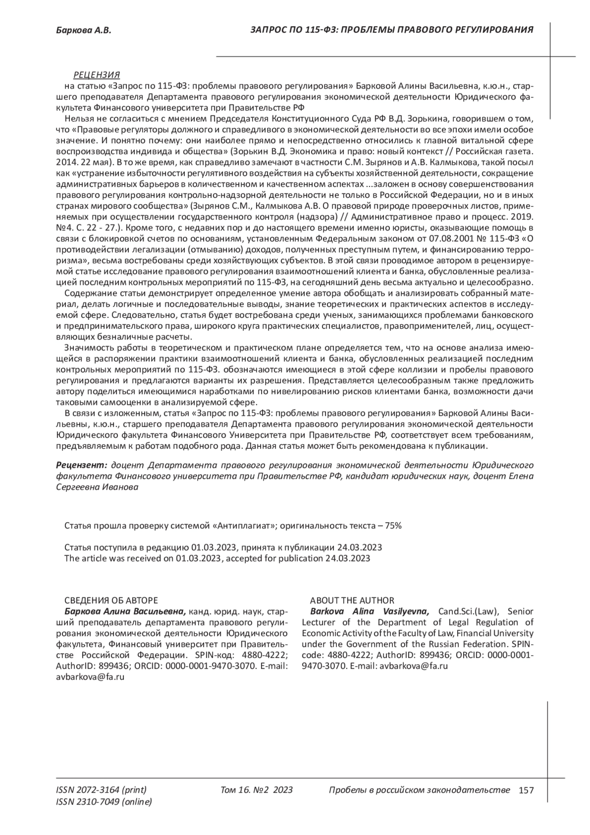 Kukushkin V.M. On the balance of private and public interests in the field of combating the legalization of proceeds from crime // Banking Law. 2015. N 2. P. 40 - 44. EDN: TNDMUH