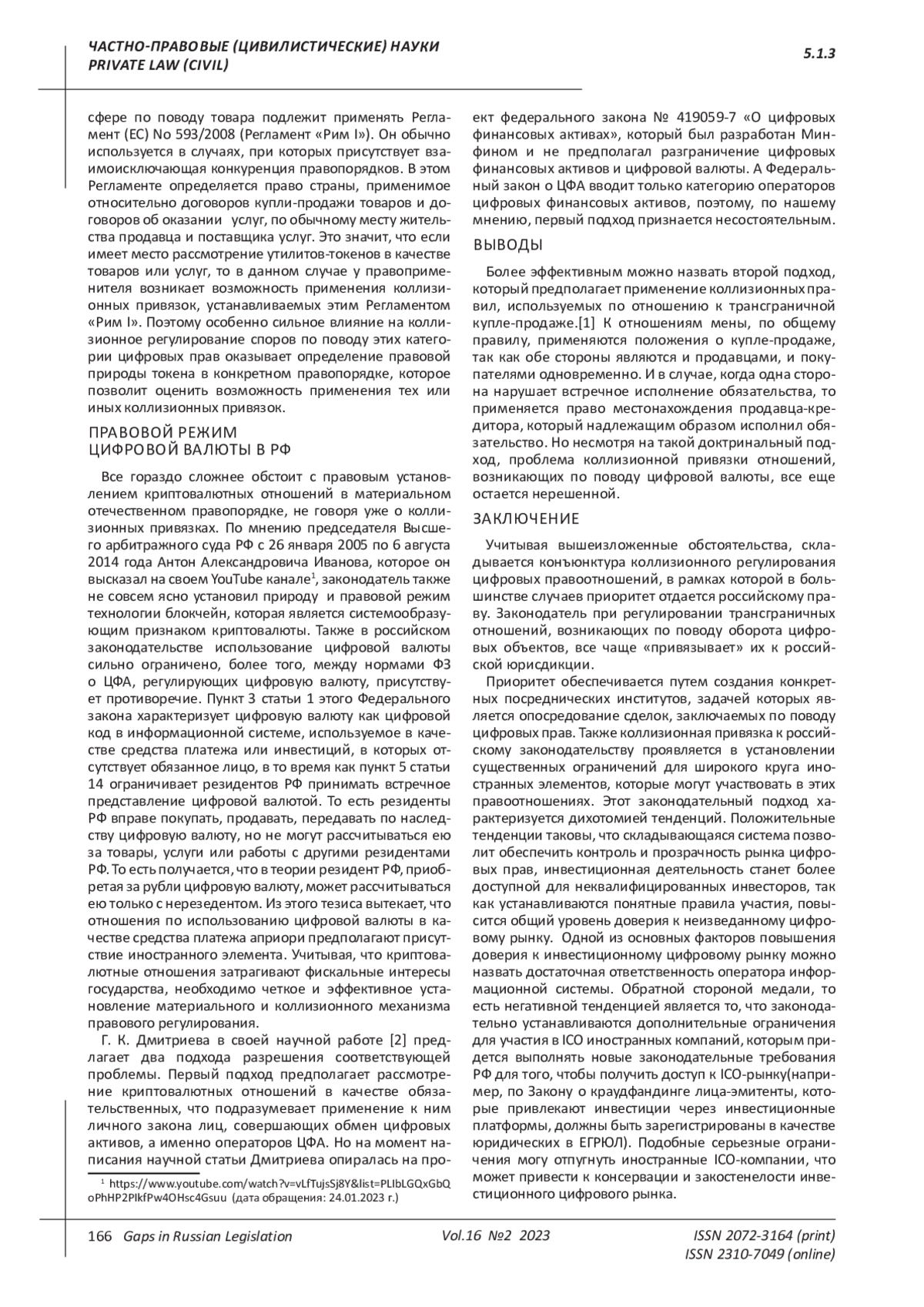 Все гораздо сложнее обстоит с правовым установлением криптовалютных отношений в материальном отечественном правопорядке, не говоря уже о коллизионных привязках. По мнению председателя Высшего арбитражного суда РФ с 26 января 2005 по 6 августа 2014 года Антон Александровича Иванова, которое он высказал на своем YouTube канале1, законодатель также не совсем ясно установил природу и правовой режим технологии блокчейн, которая является системообразующим признаком криптовалюты. Также в российском законодательстве использование цифровой валюты сильно ограничено, более того, между нормами ФЗ о ЦФА, регулирующих цифровую валюту, присутствует противоречие. Пункт 3 статьи 1 этого Федерального закона характеризует цифровую валюту как цифровой код в информационной системе, используемое в качестве средства платежа или инвестиций, в которых отсутствует обязанное лицо, в то время как пункт 5 статьи 14 ограничивает резидентов РФ принимать встречное представление цифровой валютой. То есть резиденты РФ вправе покупать, продавать, передавать по наследству цифровую валюту, но не могут рассчитываться ею за товары, услуги или работы с другими резидентами РФ.