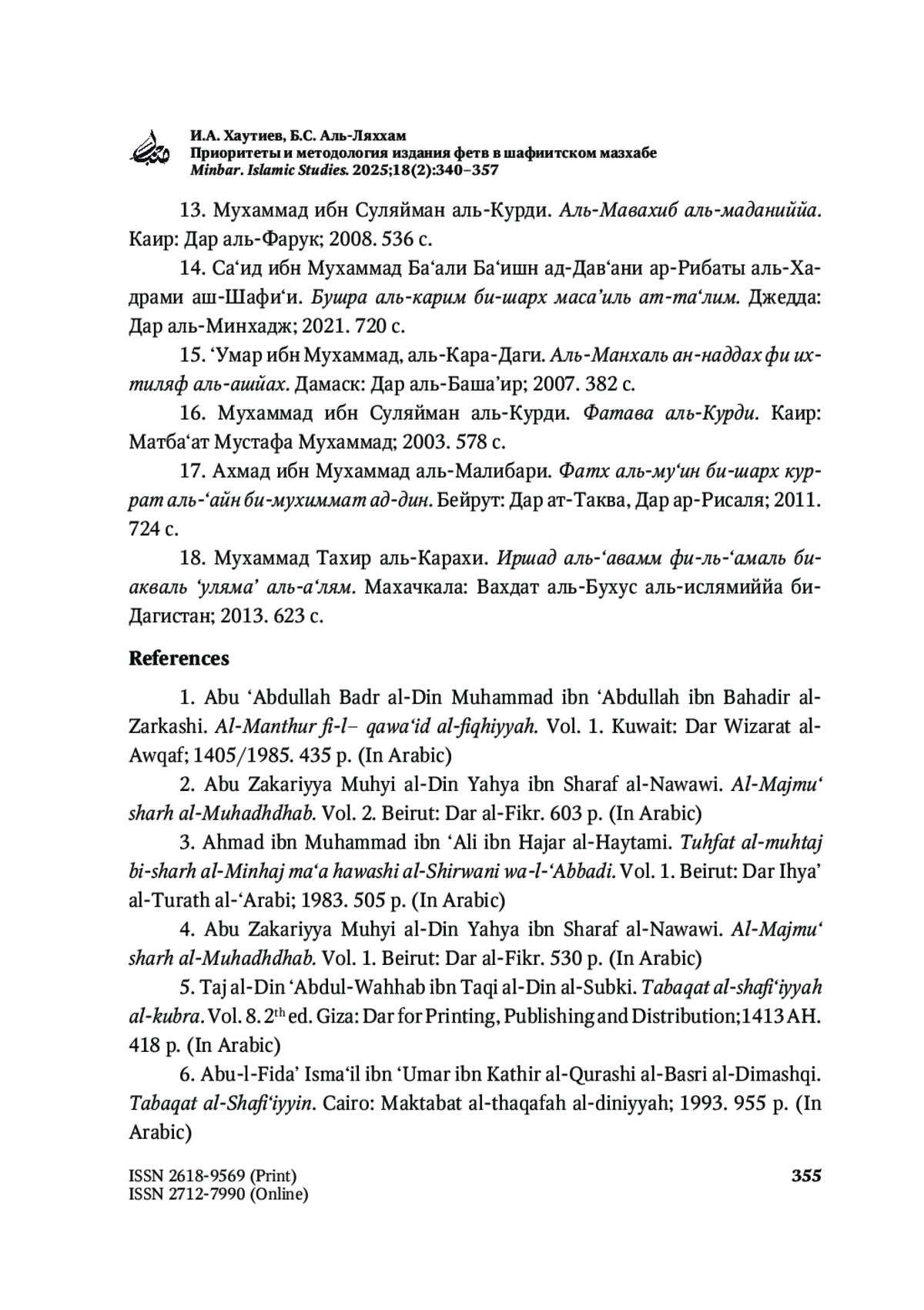 12. Ахмад ибн Мухаммад ибн ‘Али ибн Хаджар аль-Хайтами. Тухфат аль-мухтадж би-шарх аль-Минхадж ма‘а хаваши аш-Ширвани ва-ль-‘Аббади. Т. 9. Бейрут: Дар Ихйа’ ат-турас аль-‘араби; б. г. 409 с.