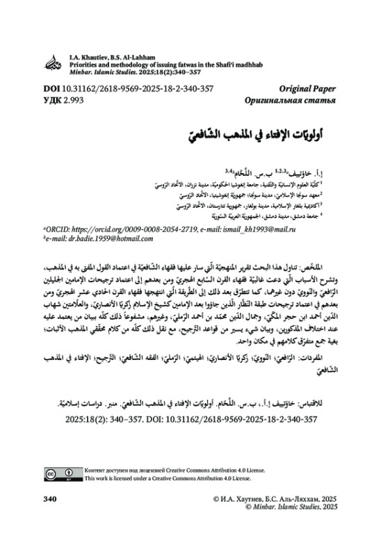 В данном исследовании рассматривается методология, которой следовали правоведы шафиитского мазхаба при определении основополагающего мнения (фетвы) в рамках своего учения. В статье объясняются причины, по которым большинство правоведов VII века хиджры и последующих периодов предпочли принять мнения двух великих имамов – ар-Рафи‘и и ан-Навави, а не других. Также в статье анализируется подход, который использовали правоведы XI века хиджры и последующих периодов, принимая мнения таких выдающихся теоретиков, как шейх-аль-ислям Закариййа аль-Ансари, и ученых Шихаб-ад-дина Ахмада ибн Хаджара аль-Макки, Джамаль-ад-дина Мухаммада ибн Ахмада ар-Рамли и др. Кроме того, в статье разъясняется, чье мнение следует принимать в случае разногласий между упомянутыми учеными, и приводятся некоторые правила определения предпочтительности (тарджих) одного мнения другому. Всё это подкрепляется цитатами из трудов авторитетных исследователей мазхаба, изложенными с целью собрать их разрозненные высказывания в одном месте.