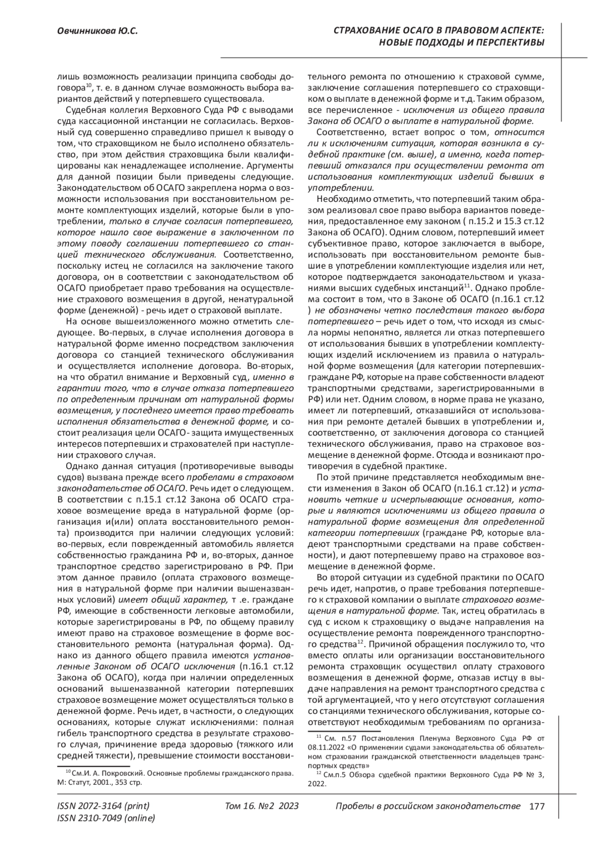 В статье отмечена актуальность на сегодняшний день проблем правоприменения в правоотношениях по страхованию гражданской ответственности владельцев транспортных средств. Автором затронуты экономические и правовые аспекты ОСАГО. Проанализирована судебная практика, выявлены пробелы в законодательстве, сделаны предложения по внесению соответствующих изменений. Выводы. По своей правовой природе субъективное право выбора, предоставленное законом потерпевшему, которое состоит в осуществлении ремонта транспортного средства, (несмотря на несоответствие требованиям) или в отказе от исполнения страхового обязательства в натуре, не является возможностью выбора способа исполнения, под которым понимается денежная или натуральная формы страхового возмещения. По этой причине страховое обязательство для данной категории потерпевших (граждане РФ, которые являются собственниками транспортных средств, зарегистрированных в РФ) не относится к альтернативным. В законодательстве необходимо установить четкие и исчерпывающие основания, которые и являются исключениями из общего правила о натуральной форме возмещения для определенной категории потерпевших (граждане РФ, которые являются собственниками транспортных средств, зарегистрированных в РФ). Страховое обязательство (речь идет, в том числе, и об ОСАГО) и правоотношение по возмещению вреда в той части, в которой он не покрыт страховым возмещением, являются по своей правовой природе самостоятельными обязательствами.