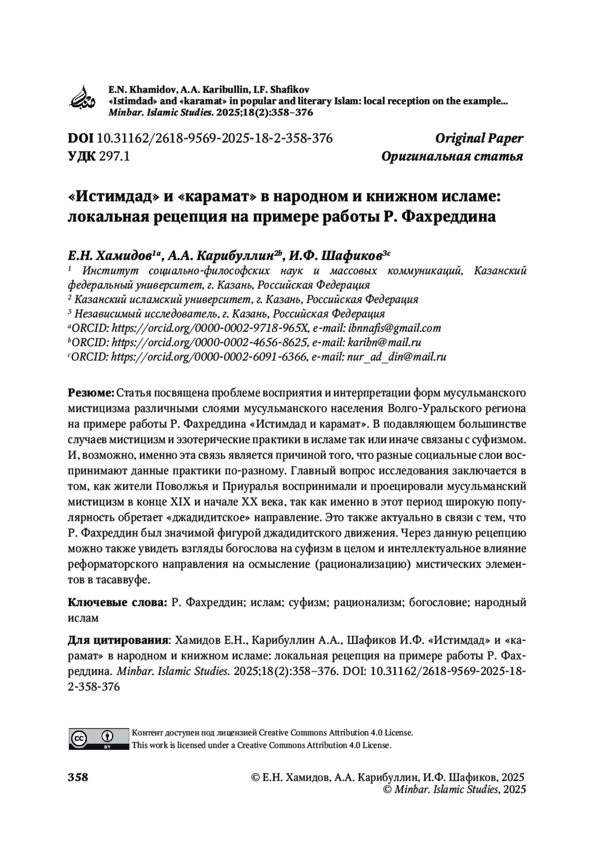 Статья посвящена проблеме восприятия и интерпретации форм мусульманского мистицизма различными слоями мусульманского населения Волго-Уральского региона на примере работы Р. Фахреддина «Истимдад и карамат». В подавляющем большинстве случаев мистицизм и эзотерические практики в исламе так или иначе связаны с суфизмом. И, возможно, именно эта связь является причиной того, что разные социальные слои воспринимают данные практики по-разному. Главный вопрос исследования заключается в том, как жители Поволжья и Приуралья воспринимали и проецировали мусульманский мистицизм в конце XIX и начале XX веков, так как именно в этот период широкую популярность обретает «джадидитское» направление. Это также актуально в связи с тем, что Р. Фахреддин был значимой фигурой джадидитского движения. Через данную рецепцию можно также увидеть взгляды богослова на суфизм в целом и интеллектуальное влияние реформаторского направления на осмысление (рационализацию) мистических элементов в тасаввуфе.