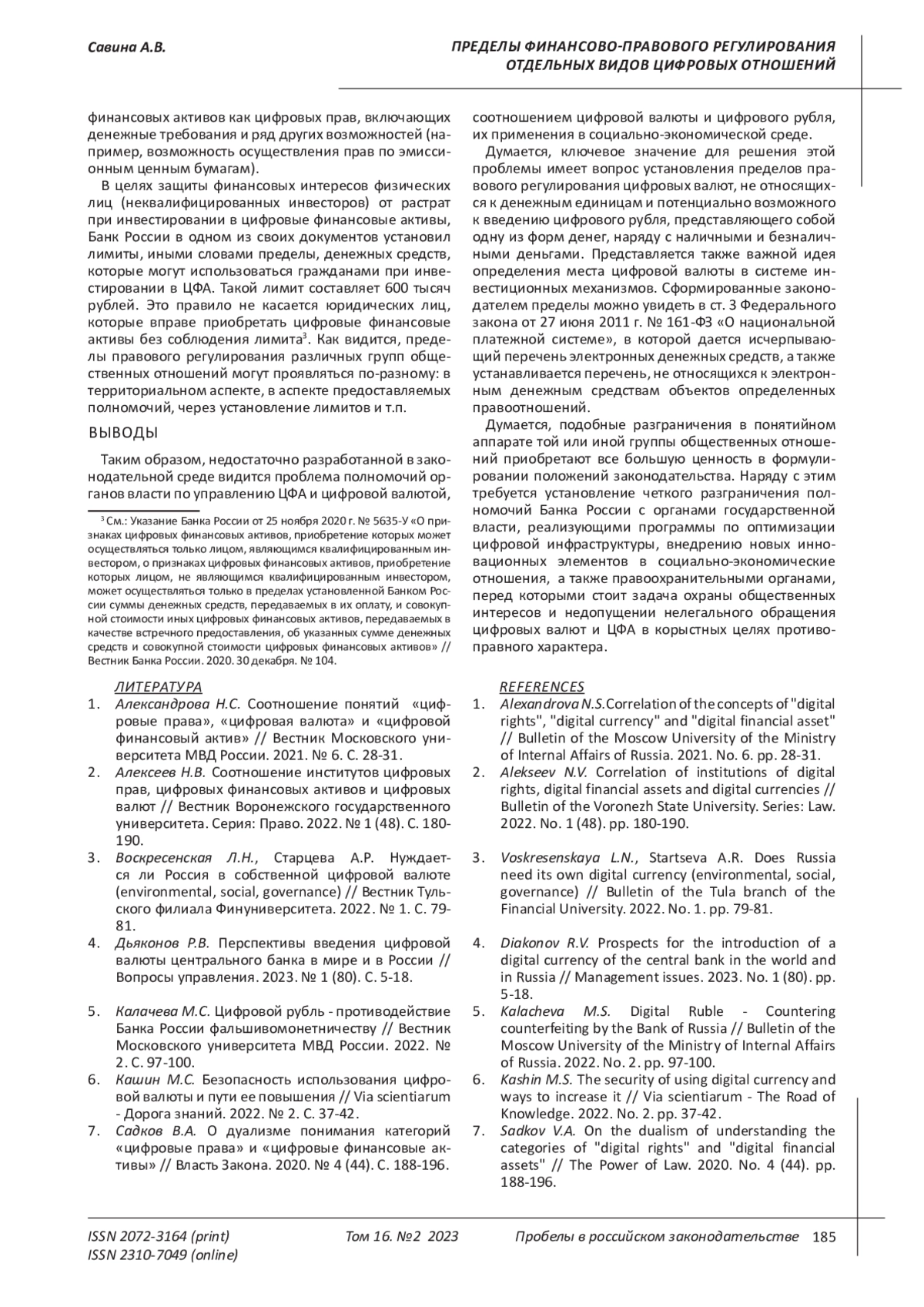 2. Алексеев Н.В. Соотношение институтов цифровых прав, цифровых финансовых активов и цифровых валют // Вестник Воронежского государственного университета. Серия: Право. 2022. № 1 (48). С. 180-190. EDN: YBDIQN