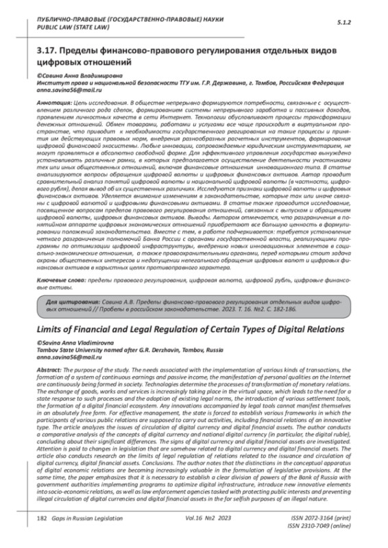 Цель исследования. В обществе непрерывно формируются потребности, связанные с осуществлением различного рода сделок, формированием системы непрерывного заработка и пассивных доходов, проявлением личностных качеств в сети Интернет. Технологии обусловливают процессы трансформации денежных отношений. Обмен товарами, работами и услугами все чаще происходит в виртуальном пространстве, что приводит к необходимости государственного реагирования на такие процессы и принятия им действующих правовых норм, внедрения разнообразных расчетных инструментов, формирования цифровой финансовой экосистемы. Любые инновации, сопровождаемые юридическим инструментарием, не могут проявляться в абсолютно свободной форме. Для эффективного управления государство вынуждено устанавливать различные рамки, в которых предполагается осуществление деятельности участниками тех или иных общественных отношений, включая финансовые отношения инновационного типа. В статье анализируются вопросы обращения цифровой валюты и цифровых финансовых активов. Автор проводит сравнительный анализ понятий цифровой валюты и национальной цифровой валюты (в частности, цифрового рубля), делая вывод об их существенных различиях. Исследуются признаки цифровой валюты и цифровых финансовых активов. Уделяется внимание изменениям в законодательстве, которые так или иначе связаны с цифровой валютой и цифровыми финансовыми активами. В статье также проводится исследование, посвященное вопросам пределов правового регулирования отношений, связанных с выпуском и обращением цифровой валюты, цифровых финансовых активов. Выводы. Автором отмечается, что разграничения в понятийном аппарате цифровых экономических отношений приобретают все большую ценность в формулировании положений законодательства. Вместе с тем, в работе подчеркивается: требуется установление четкого разграничения полномочий Банка России с органами государственной власти, реализующими программы по оптимизации цифровой инфраструктуры, внедрению новых инновационных элементов в социально-экономические отношения, а также правоохранительными органами, перед которыми стоит задача охраны общественных интересов и недопущении нелегального обращения цифровых валют и цифровых финансовых активов в корыстных целях противоправного характера.