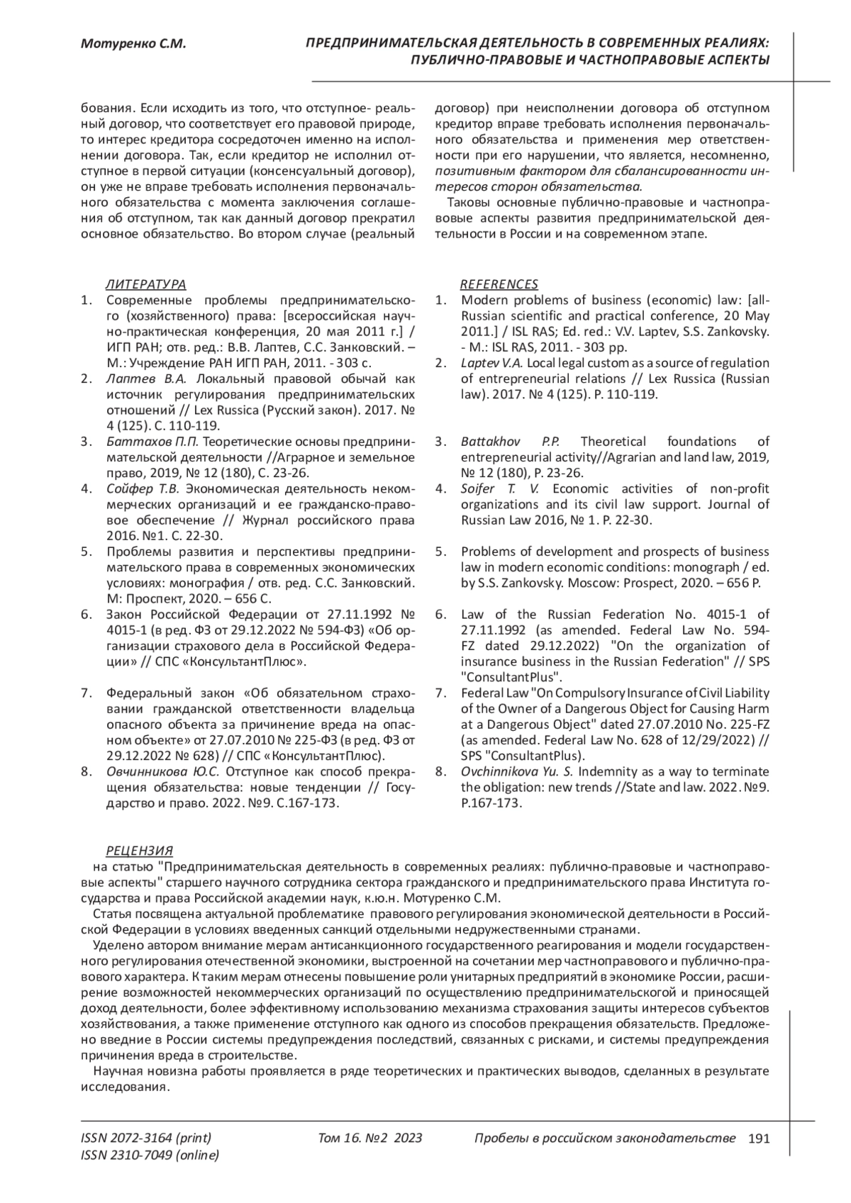 8. Овчинникова Ю.С. Отступное как способ прекращения обязательства: новые тенденции // Государство и право. 2022. №9. С.167-173. EDN: QJGYDH