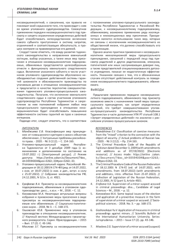 В статье раскрывается вопрос избрания и применения к лицам, не достигшим 18-летнего возраста, неизоляционной меры пресечения в виде присмотра и запрета определенных действий в отношении несовершеннолетних. Анализируются особенности осуществления присмотра за несовершеннолетними субъектами преступления родителями, опекунами, попечителями, иными лицами. Предлагается включение в уголовно-процессуальное законодательство Республики Таджикистан такой меры пресечения, как запрет определенных действий (по аналогии со статьей 105.1 Уголовно-процессуального кодекса Российской Федерации). С учетом тенденций развития таджикского законодательства в направлении формирования системы ювенальной юстиции, отмечается целесообразность включения избрания мер принуждения в отношении несовершеннолетних подозреваемых, обвиняемых в функционал ювенального следственного судьи, что будет служить дополнительной гарантией законности при осуществлении уголовного судопроизводства в отношении указанных лиц.