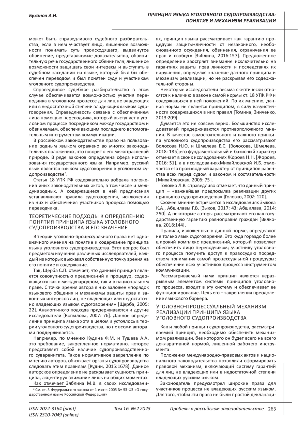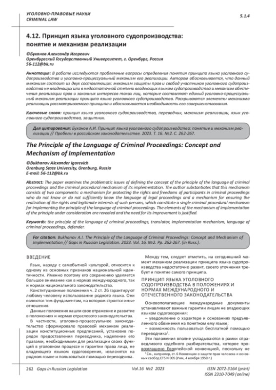 Zhoroev N.N. The principle of the language of criminal proceedings in the system of principles of the Russian criminal process // Education. Science, Scientific personnel. - 2016. No. 6. p. 51. EDN: XRIIVR