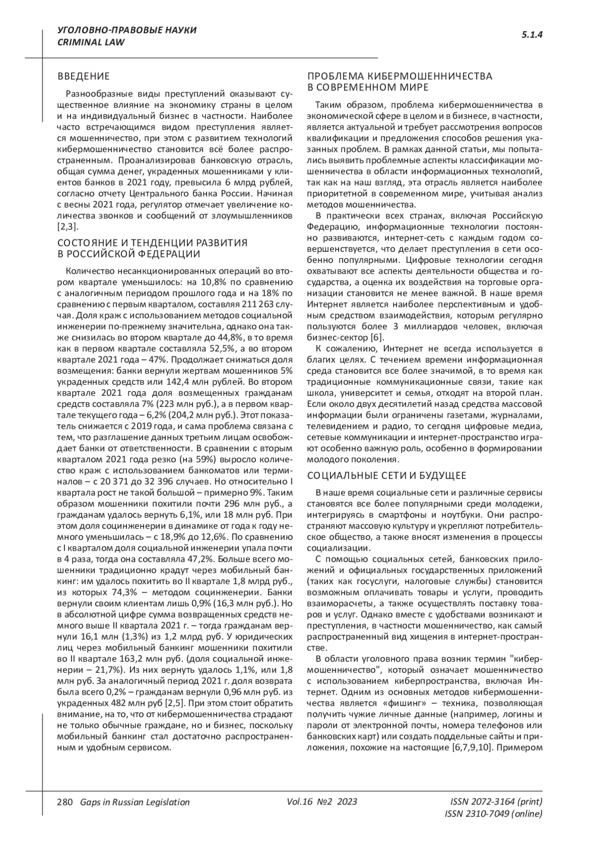 В данной статье акцент делается на актуальность проблем, связанных с угрозами мошеннических действий, затрагивающих бизнес и отдельных граждан. Подробно исследуется ситуация, связанная с хищением средств через телекоммуникационные каналы связи. Рассматривается распространенный метод мошенничества, который влияет на бизнес и граждан. В статье раскрывается понятие фишинга, а также анализируются нормы, касающиеся уголовно-правовой защиты этих отношений. Изучаются все виды мошенничества, предусмотренные Уголовным кодексом Российской Федерации. Целью исследования является демонстрация угрозы, которую мошенническая деятельность с использованием фишинга представляет для бизнеса и общества, и предложение способов решения этих проблем. Выводы. В результате исследования авторы предлагают внести изменения в постановление Пленума Верховного Суда Российской Федерации, касающиеся понятия фишинга и всех возможных способов мошенничества на современном этапе развития общества и государства. Для правоприменителей рекомендуется квалифицировать совершенные действия по статье 159 Уголовного кодекса Российской Федерации, так как данная норма охватывает весь спектр возможных способов. Кроме того, авторы предлагают декриминализовать статью 159.6 Уголовного кодекса Российской Федерации, поскольку она не отражает современную реальность и приводит к ошибкам при ее применении.