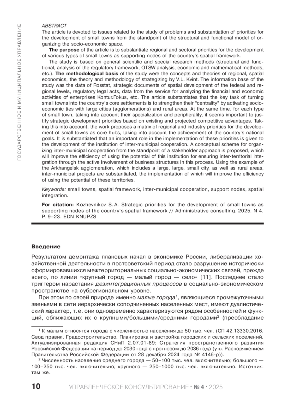 Целью статьи является обоснование регионально-отраслевых приоритетов развития различных типов малых городов как опорных узлов пространственного каркаса страны. Исследование базируется на общенаучных и специальных методах исследования (структурно-функциональный, анализ нормативно-правовой базы, OTSW-анализ, экономикоматематические методы и др.). Методологической основой исследования выступили концепции и теории региональной, пространственной экономики, теория и методология стратегирования В. Л. Квинта. Информационной базой исследования выступили данные Росстата, стратегические документы пространственного развития федерального и регионального уровней, нормативно-правовые акты, данные сервиса аналитики финансовоэкономической деятельности предприятий «Контур. Фокус» и др.
