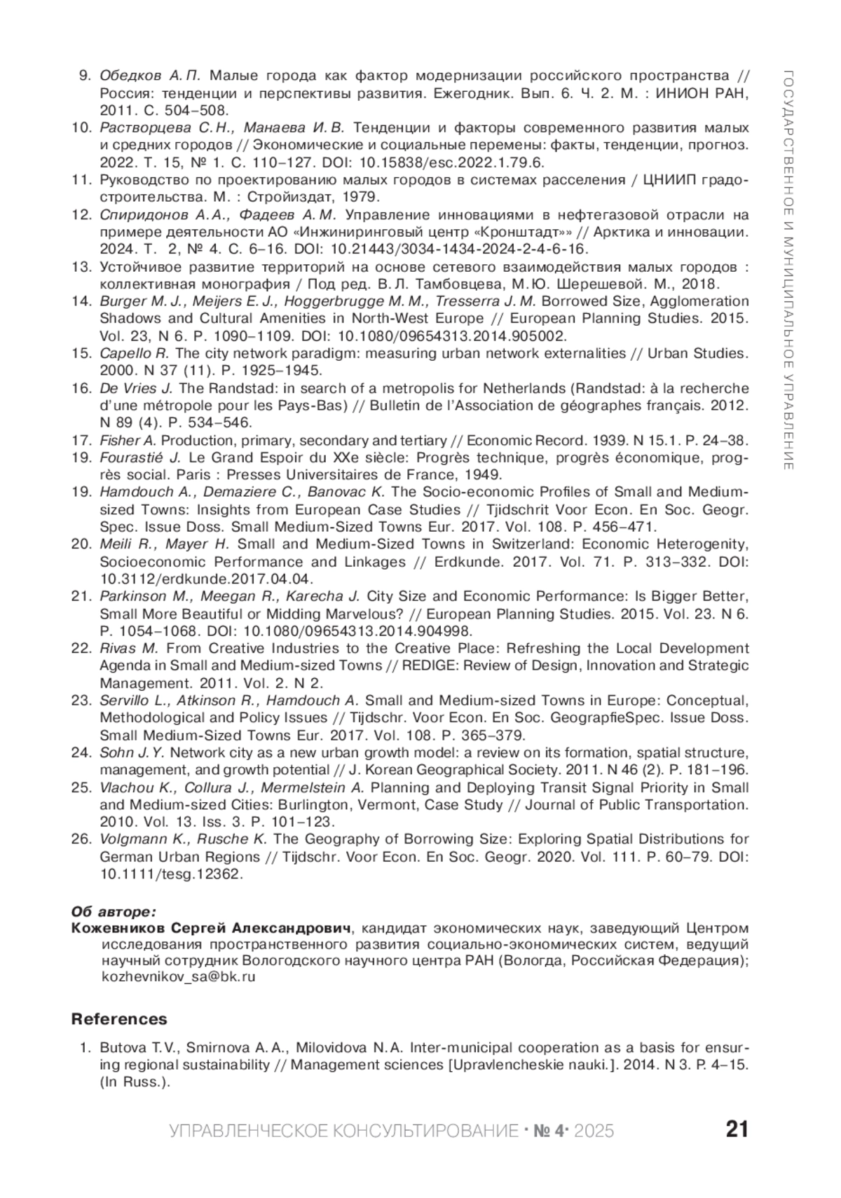 4. Кожевников С. А. Модернизация экономики малых городов российского Севера на основе активизации межмуниципальных хозяйственных связей // Север и рынок: формирование экономического порядка. 2023. № 3. С. 150-164. https://doi.org/10.37614/2220-802X.3.2023.81.010.