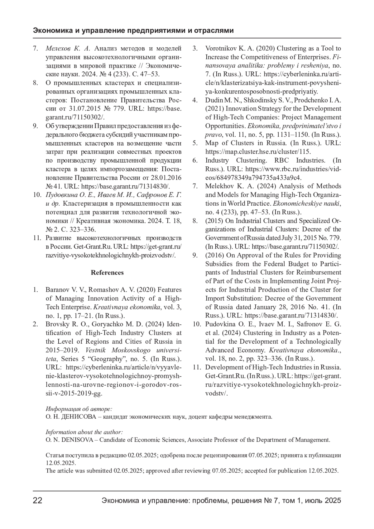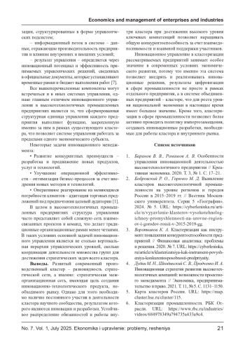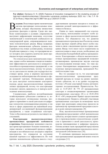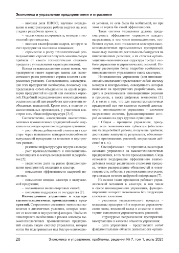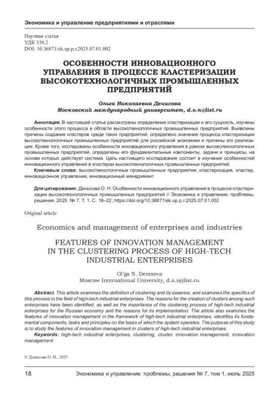 В настоящей статье рассмотрены определение кластеризации и его сущность, изучены особенности этого процесса в области высокотехнологичных промышленных предприятий. Выявлены причины создания кластеров среди таких предприятий, определено значение процесса кластеризации высокотехнологичных промышленных предприятий для российской экономики и причины его реализации. Кроме того, исследованы особенности инновационного управления в рамках высокотехнологичных промышленных предприятий, определены его фундаментальные компоненты, задачи и принципы, на основе которых действует система. Цель настоящего исследования состоит в изучении особенностей инновационного управления в кластерах высокотехнологичных промышленных предприятий.