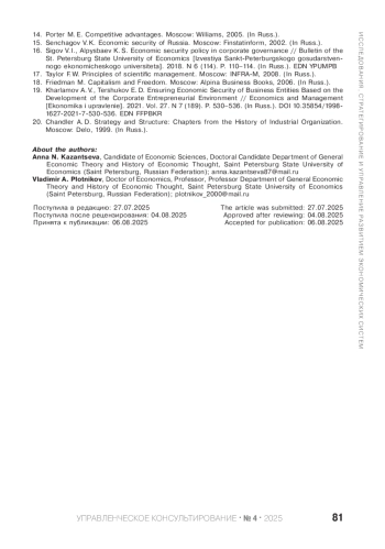 19. Харламов А.В., Тершуков Е. Д. Обеспечение экономической безопасности хозяйствующих субъектов на основе развития корпоративной предпринимательской среды // Экономика и управление. 2021. Т. 27. № 7 (189). С. 530-536. https://doi.org/10.35854/1998-1627-2021-7-530-536. EDN FFPBKR