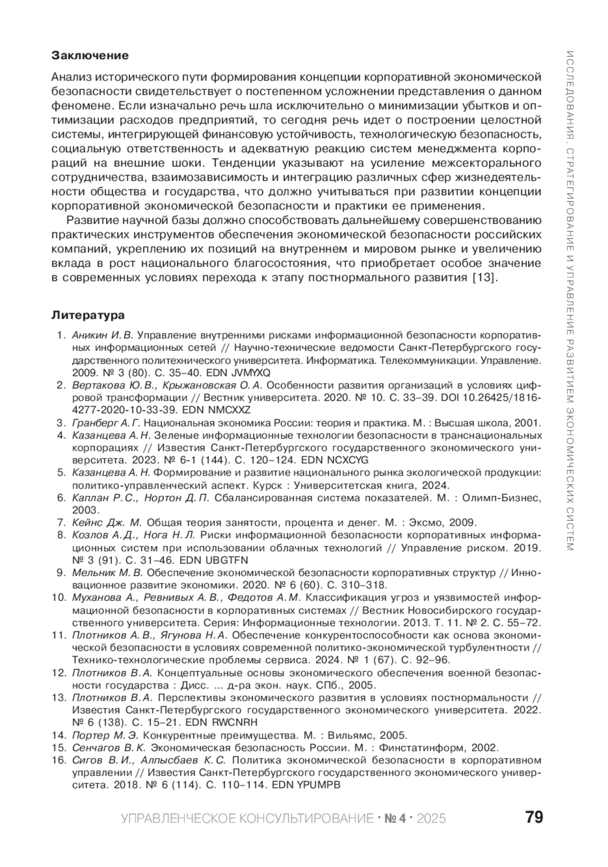 16. Сигов В. И., Алпысбаев К. С. Политика экономической безопасности в корпоративном управлении // Известия Санкт-Петербургского государственного экономического университета. 2018. № 6 (114). С. 110-114. EDN YPUMPB