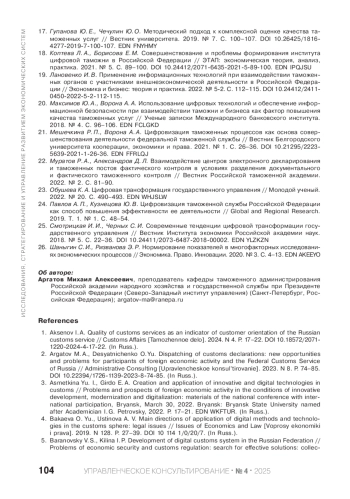 10. Бродникова А. Н. Совершенствование механизмов предоставления таможенных услуг в условиях цифровизации деятельности таможенных органов // Дневник науки. 2025. № 1. [Электронный ресурс] URL: https://dnevniknauki.ru/images/publications/2025/1/economy Brodnikova.pdf