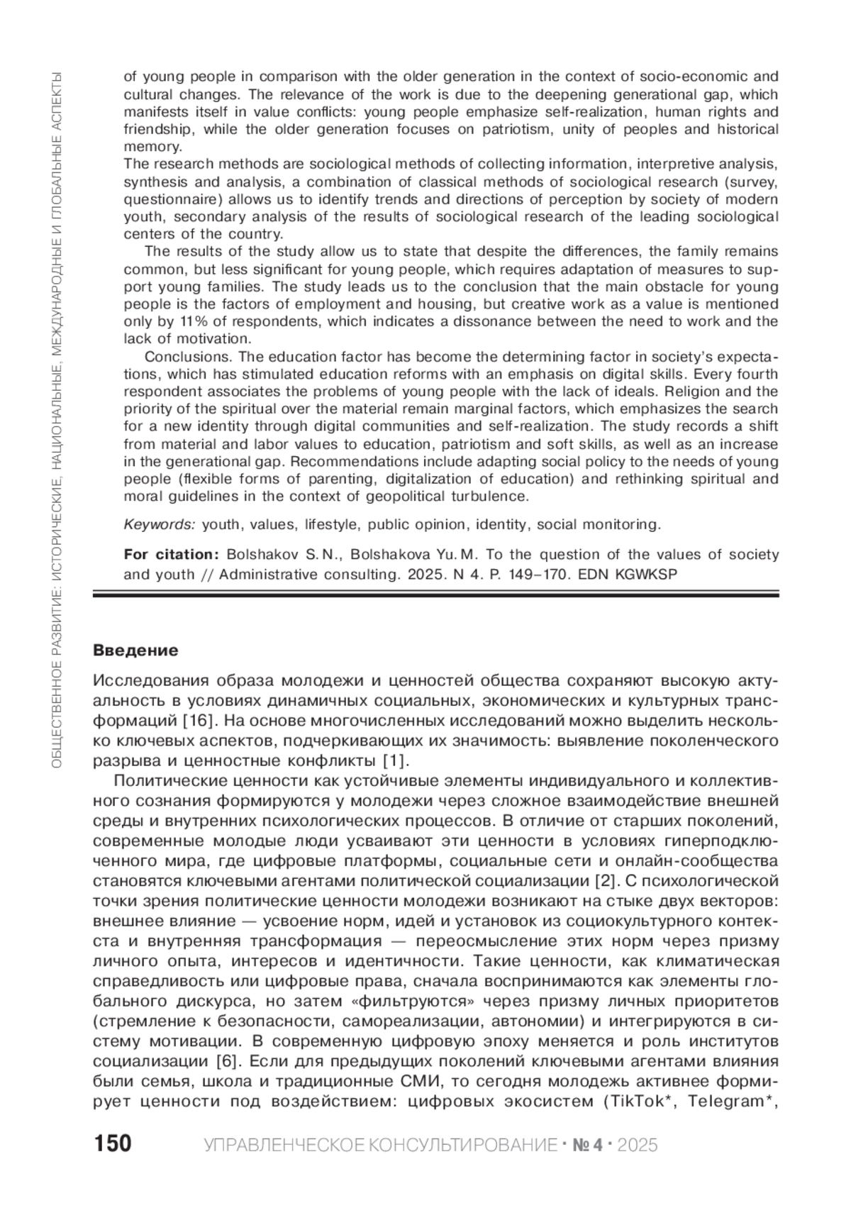 Актуальность работы обусловлена углублением поколенческого разрыва, который проявляется в ценностных конфликтах: молодежь акцентирует самореализацию, права человека и дружбу, тогда как старшее поколение фокусируется на патриотизме, единстве народов и исторической памяти.