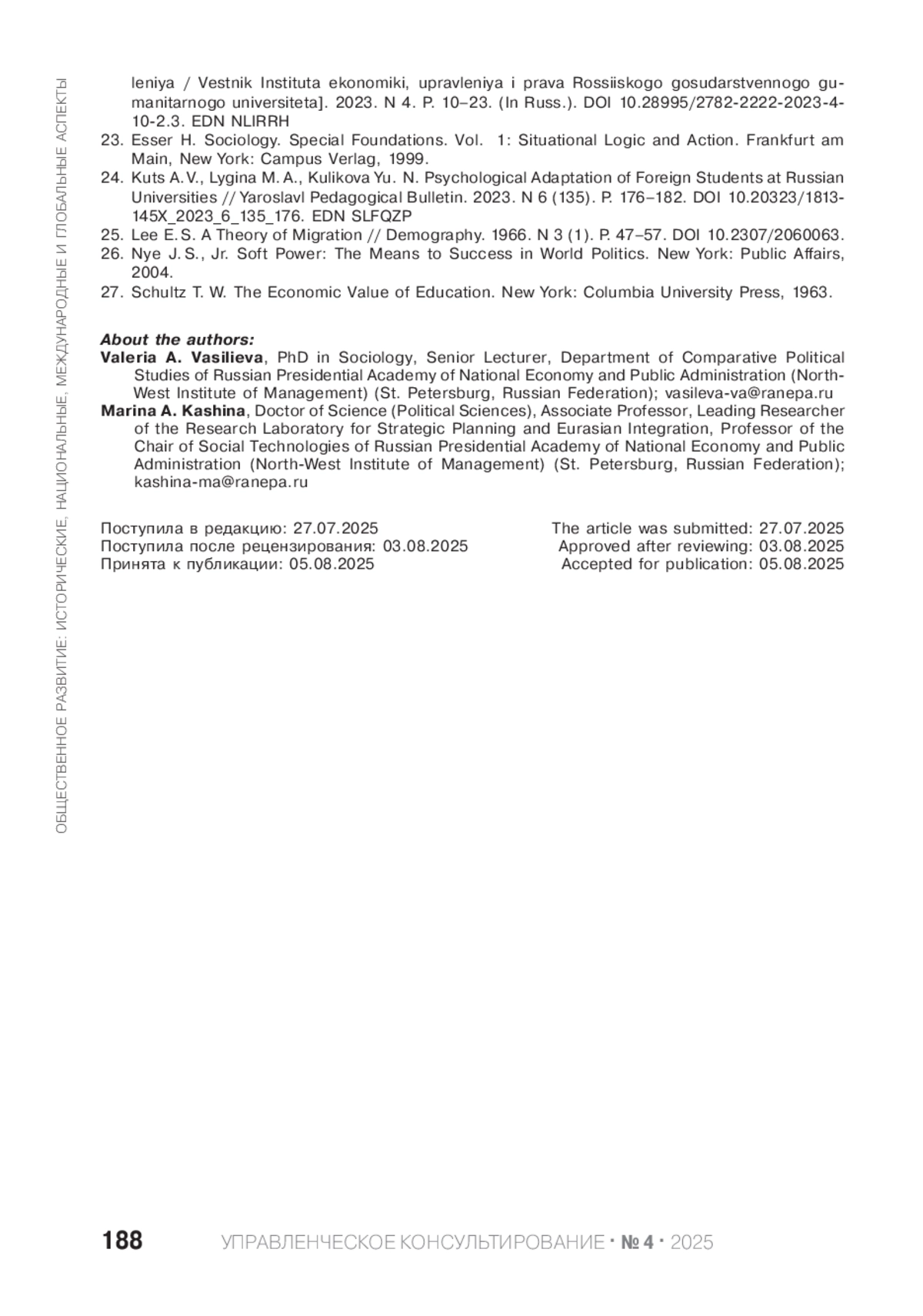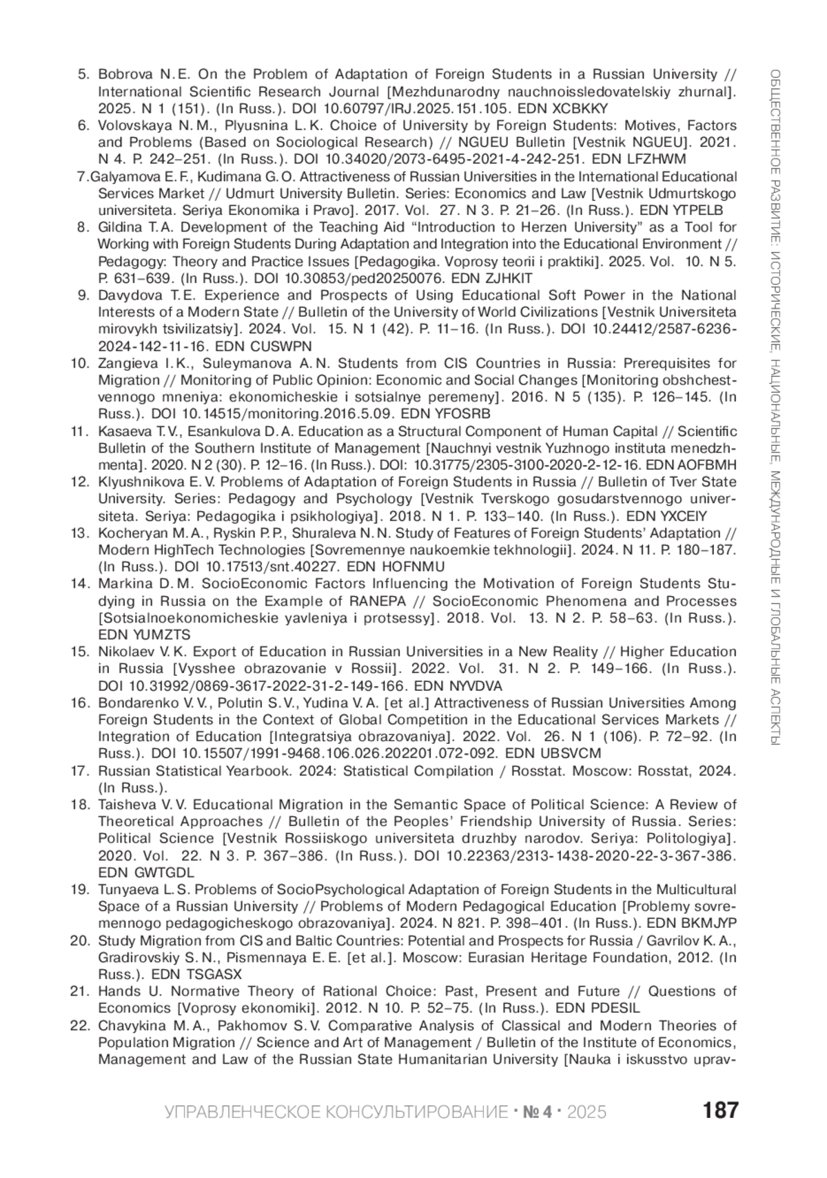 5. Боброва Н. Е. К проблеме адаптации иностранных студентов в российском вузе // Международный научно-исследовательский журнал. 2025. № 1 (151). https://doi.org/10.60797/IRJ.2025.151.105. EDN XCBKKY