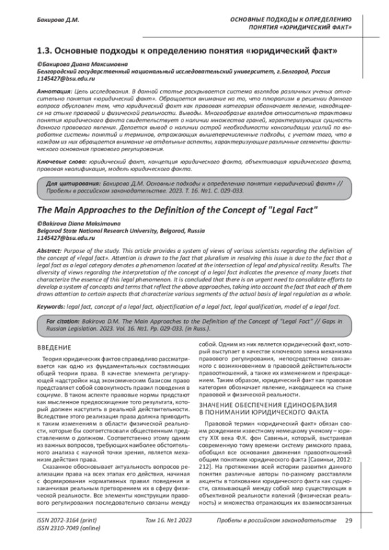 Цель исследования. В данной статье раскрывается система взглядов различных ученых относительно понятия «юридический факт». Обращается внимание на то, что плюрализм в решении данного вопроса обусловлен тем, что юридический факт как правовая категория обозначает явление, находящееся на стыке правовой и физической реальности. Выводы. Многообразие взглядов относительно трактовки понятия юридического факта свидетельствует о наличии множества граней, характеризующих сущность данного правового явления. Делается вывод о наличии острой необходимости консолидации усилий по выработке системы понятий и терминов, отражающих вышеперечисленные подходы, с учетом того, что в каждом из них обращается внимание на отдельные аспекты, характеризующие различные сегменты фактического основания правового регулирования.