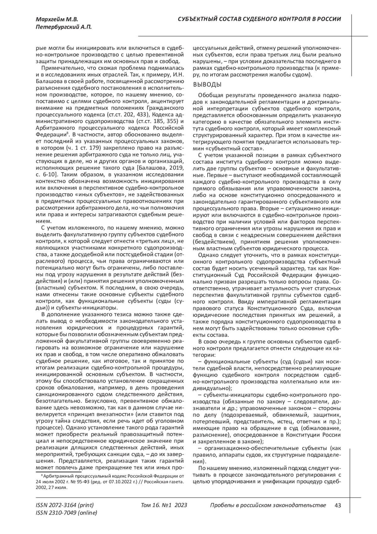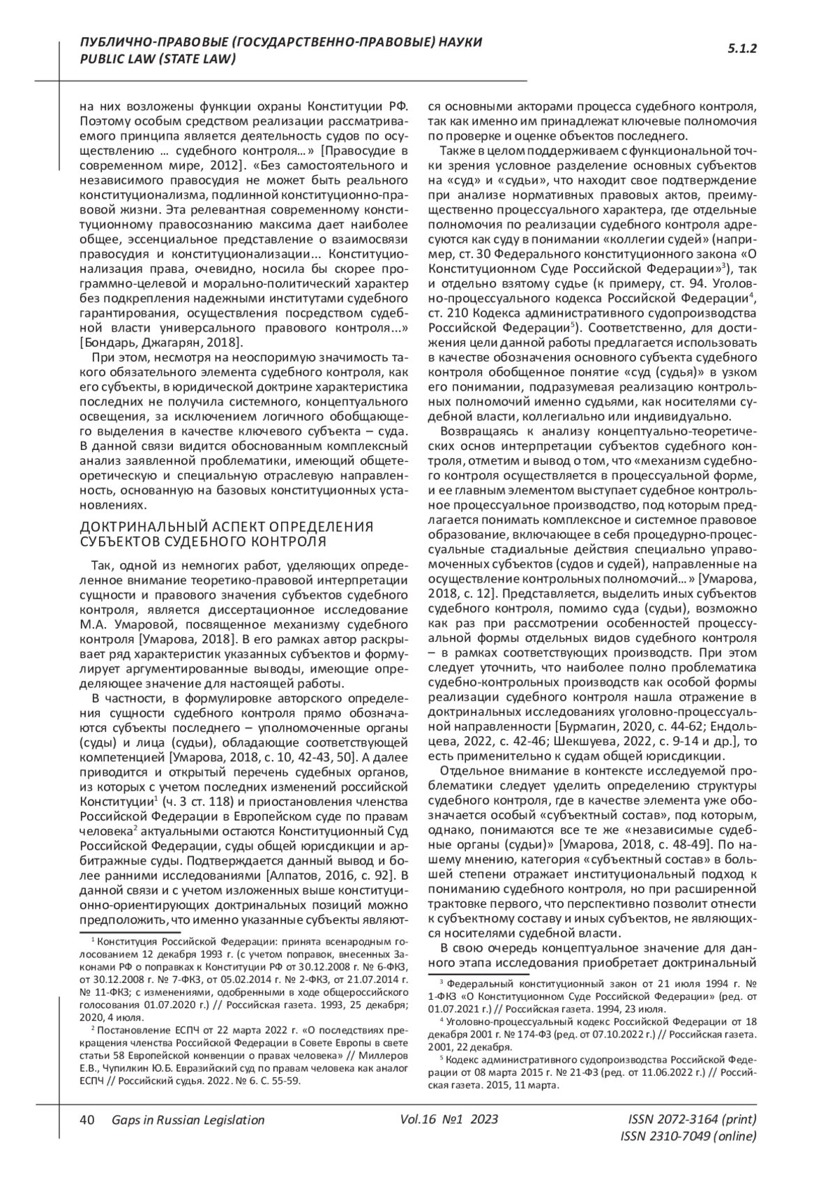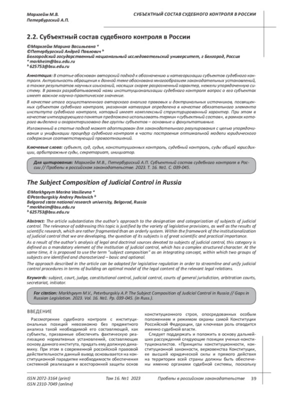 Alpatov Yu.M., (2016), Issues of procedural law and judicial control. Scientific Proceedings of the Russian Academy of Advocacy and Notary, 3 (42): 92-95.