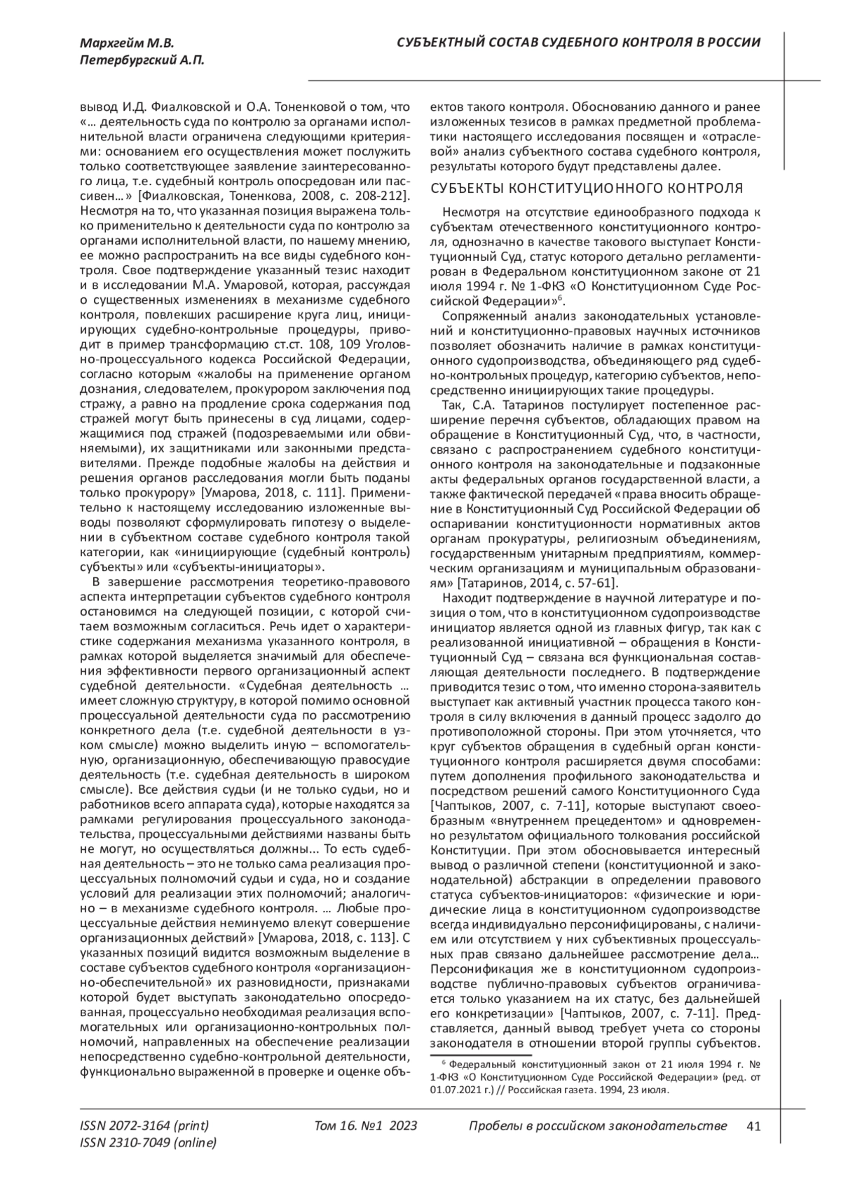 9. Татаринов С.А., (2014), К вопросу о принципах осуществления конституционного судопроизводства в Конституционном Суде Российской Федерации. Конституционное и муниципальное право, 3: 57-61. EDN: SAFNHB
