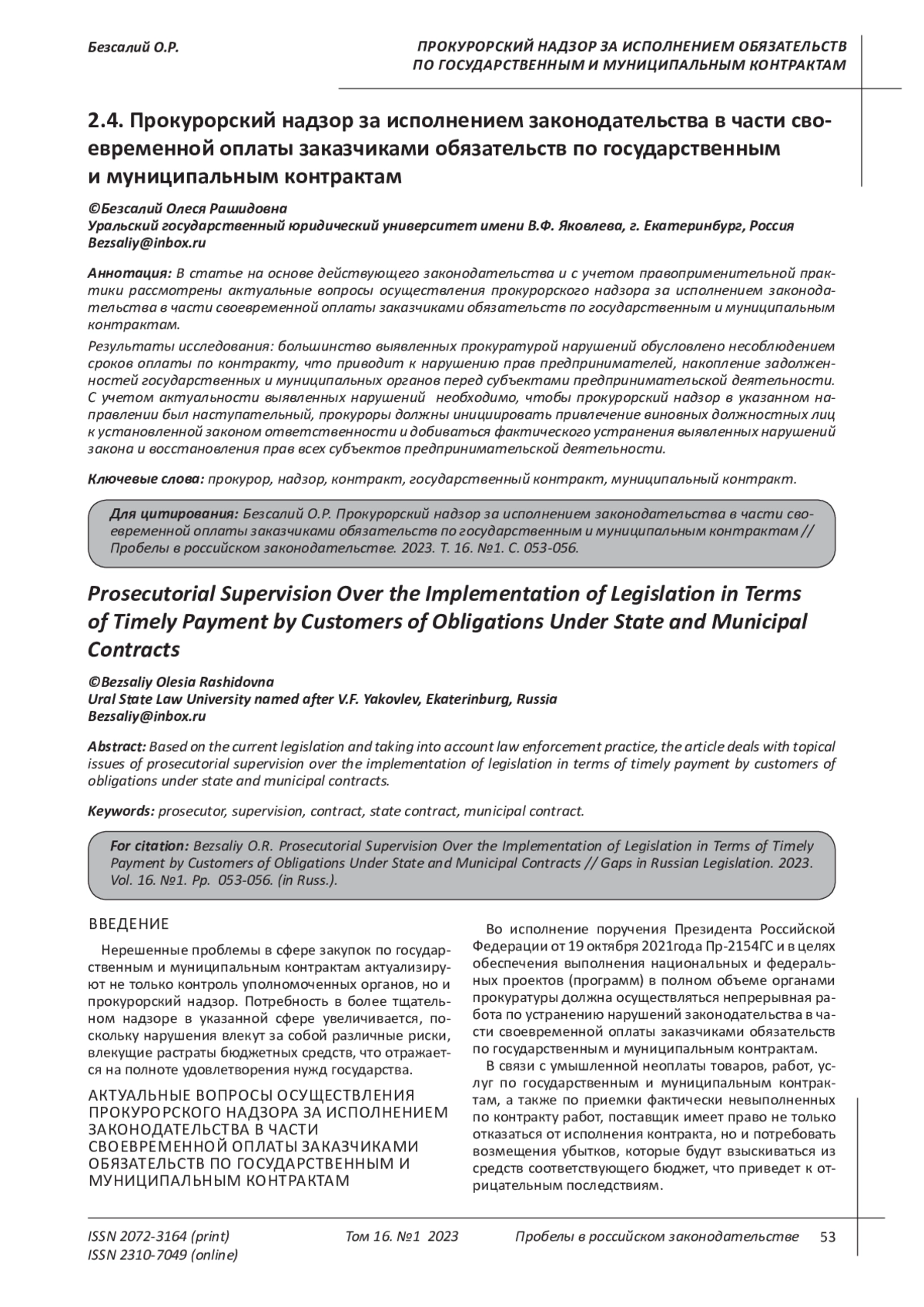 В статье на основе действующего законодательства и с учетом правоприменительной практики рассмотрены актуальные вопросы осуществления прокурорского надзора за исполнением законодательства в части своевременной оплаты заказчиками обязательств по государственным и муниципальным контрактам. Результаты исследования: большинство выявленных прокуратурой нарушений обусловлено несоблюдением сроков оплаты по контракту, что приводит к нарушению прав предпринимателей, накопление задолженностей государственных и муниципальных органов перед субъектами предпринимательской деятельности. С учетом актуальности выявленных нарушений необходимо, чтобы прокурорский надзор в указанном направлении был наступательный, прокуроры должны инициировать привлечение виновных должностных лиц к установленной законом ответственности и добиваться фактического устранения выявленных нарушений закона и восстановления прав всех субъектов предпринимательской деятельности.