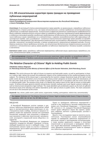 В настоящей статье рассматривается право граждан на организацию и проведение публичных мероприятий, а также участие в них, как право относительное с учетом проблемных аспектов реализации субъектами исследуемой прерогативы. Актуальность выбранной тематики представлена необходимостью более глубокого теоретического изучения права на проведение публичных мероприятий ввиду формирования у отдельных категорий граждан ошибочного представления об абсолютности исследуемого права и ростом числа публичных акций, проводимых не в соответствии с нормами законодательства либо нарушающих общественный порядок. Цель исследования - выявление относительного характера права граждан на проведение публичных мероприятий. Для достижения указанной цели использовались общенаучные и частнонаучные методы: логический, системный методы, а также исторический и сравнительно-правовой методы. В исследовании выявлены такие проблемные аспекты, как отсутствие достаточного теоретического изучения абсолютных и относительных границ права граждан на публичные мероприятия. Основные выводы изложены в заключении.