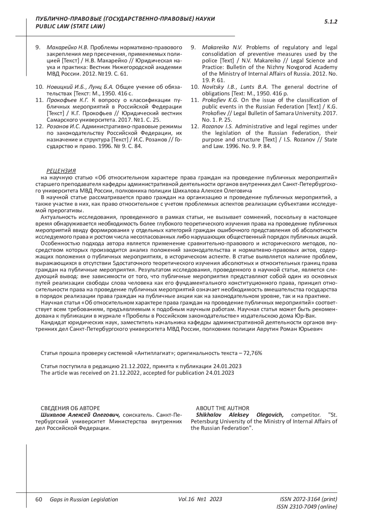 Antonova L.B., Kashirina Yu.P. The right of citizens to hold public events: the concept, content and prospects of legal regulation [Text] / L.B. Antonova, Yu.P. Kashirina // Territory of Science. 2013. No. 5. P. 70.
