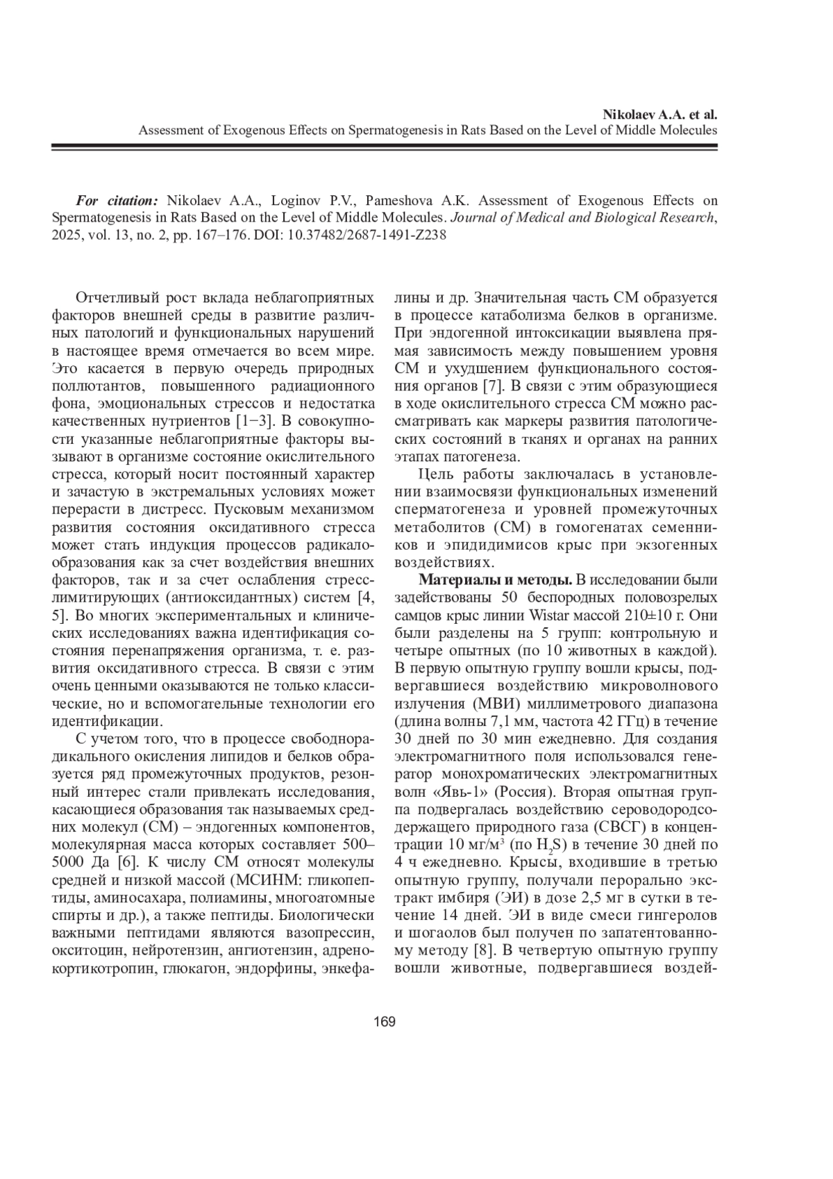 Цель работы - установление взаимосвязи функциональных изменений сперматогенеза при экзогенных воздействиях и уровней промежуточных метаболитов (средних молекул) в гомогенатах семенников и эпидидимисов крыс.