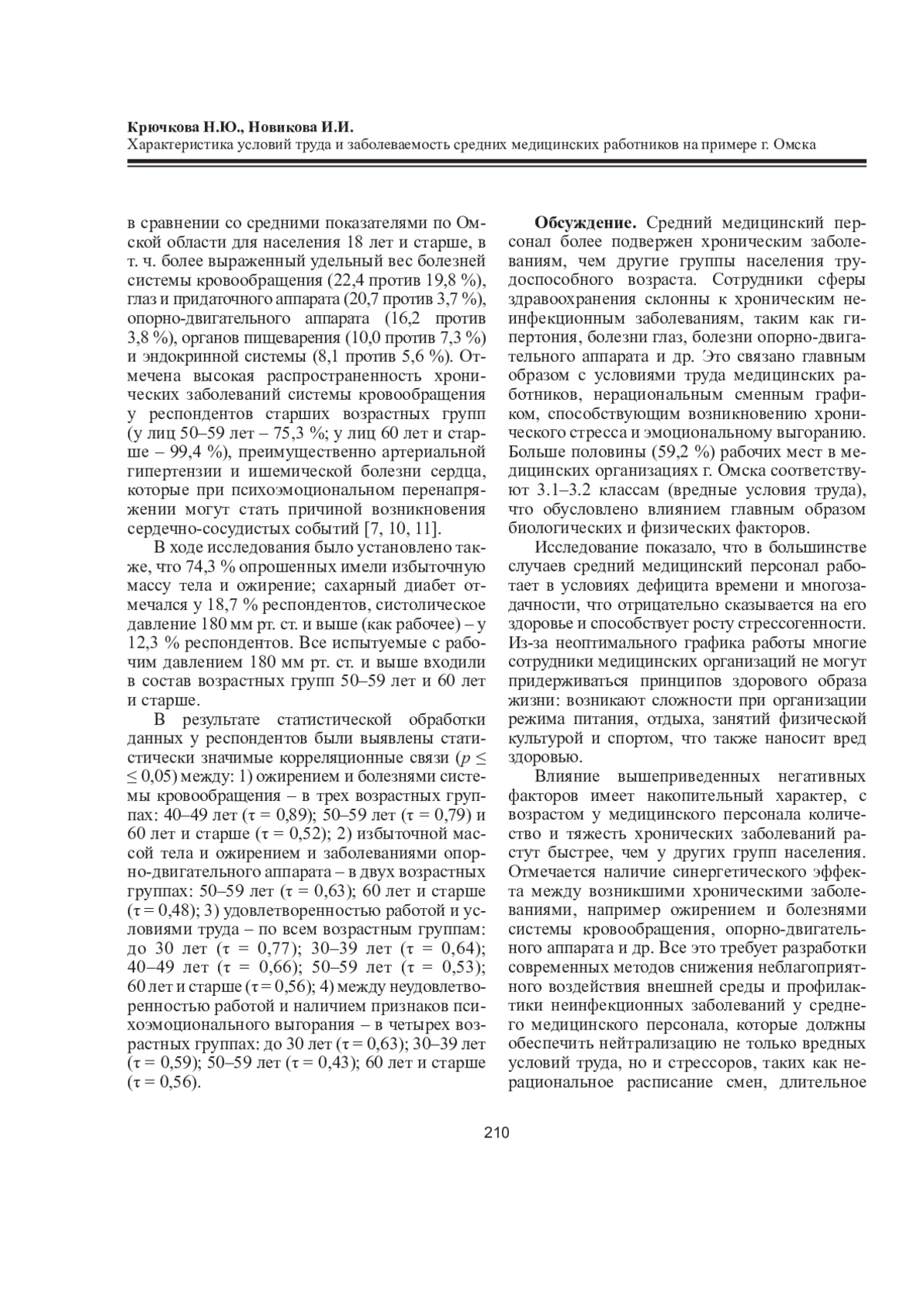 Материалы и методы. Работа выполнена на базе Центра повышения квалификации работников здравоохранения (г. Омск) в период с 2022 по 2024 год. В исследовании приняли участие 2764 чел. в возрасте от 21 до 74 лет (средний возраст - 43,6 года; стаж - от 1 года до 47 лет). Проанализированы отчеты по оценке условий работы среднего медицинского персонала (1728 рабочих мест). Проведены анкетирование, анализ заболеваемости испытуемых. Для интерпретации результатов использовались методы описательной, непараметрической статистики и когнитивной визуализации.