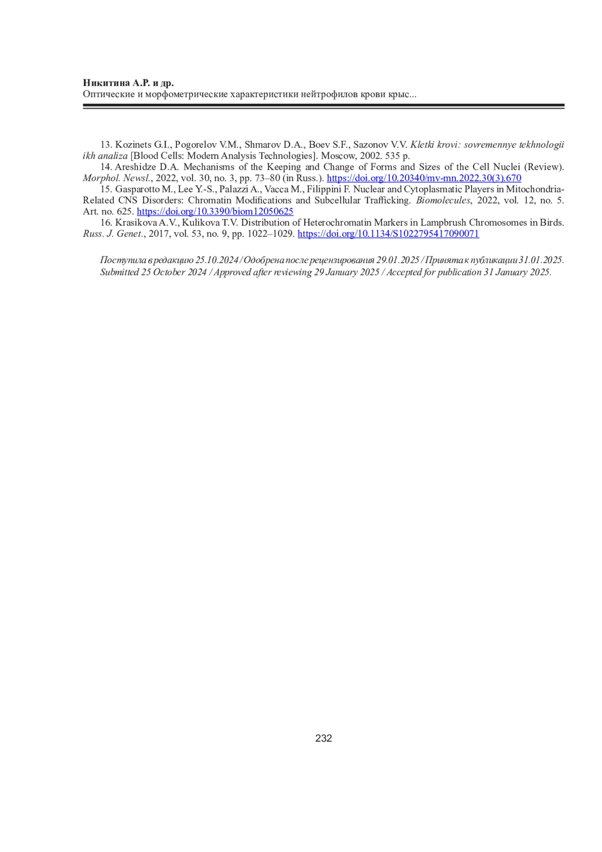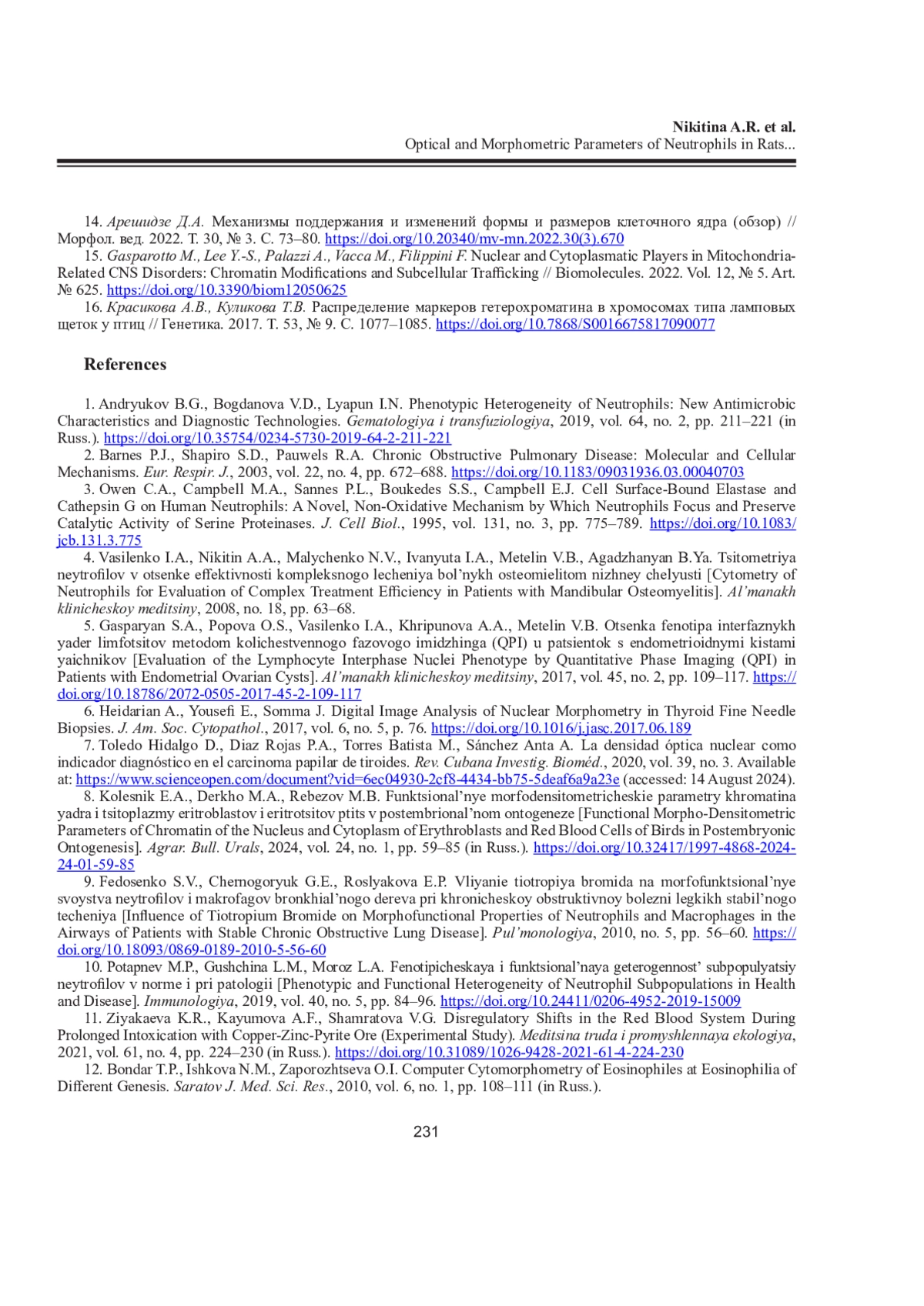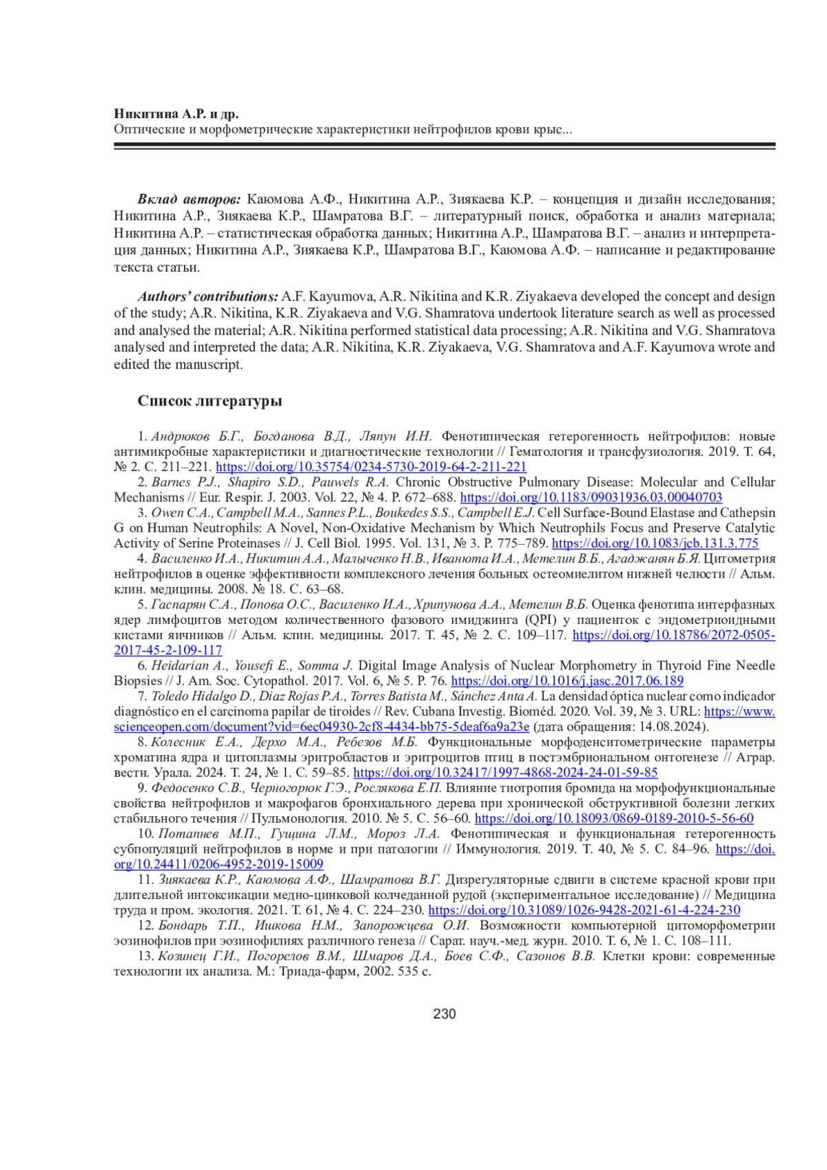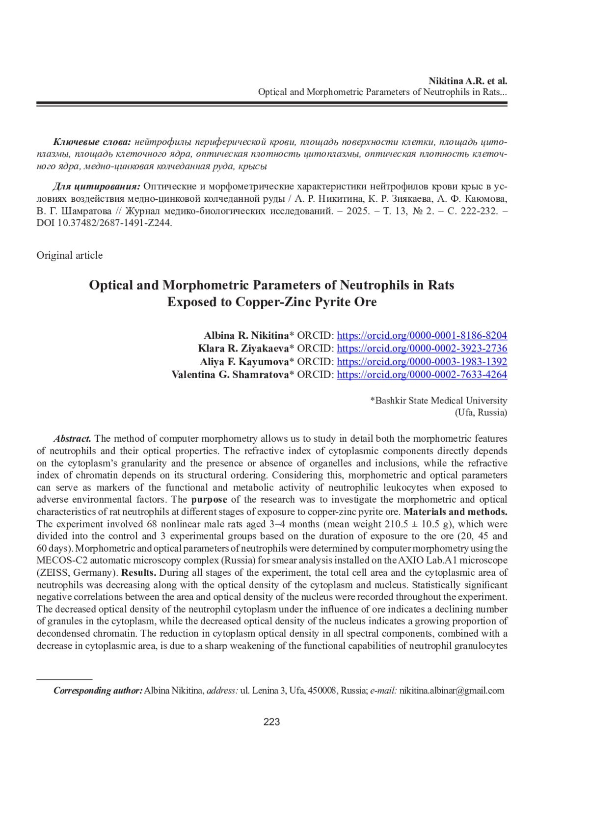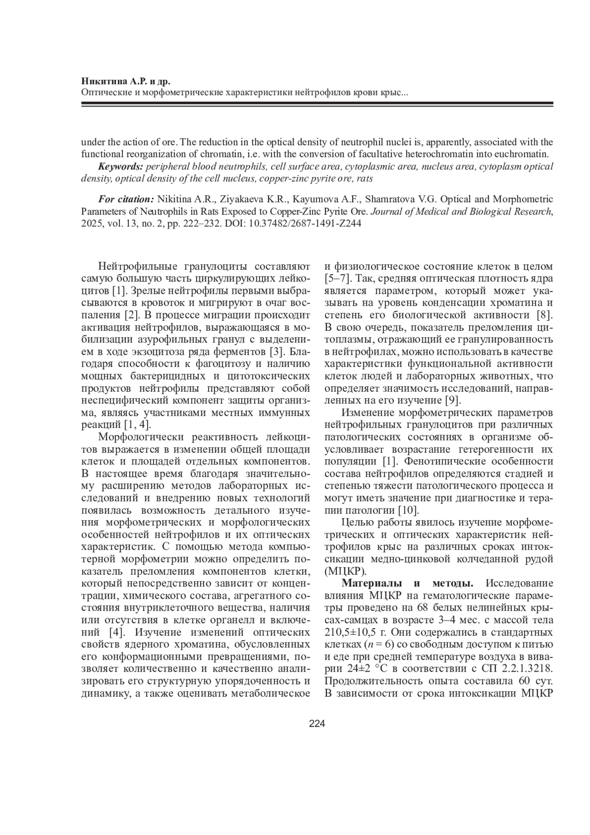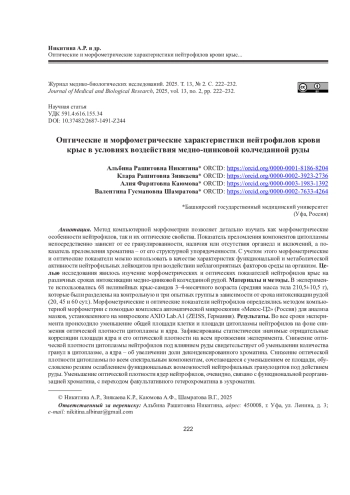 НИКИТИНА А. Р., ЗИЯКАЕВА К. Р., КАЮМОВА А. Ф., ШАМРАТОВА В. Г. ОПТИЧЕСКИЕ И МОРФОМЕТРИЧЕСКИЕ ХАРАКТЕРИСТИКИ НЕЙТРОФИЛОВ КРОВИ КРЫС В УСЛОВИЯХ ВОЗДЕЙСТВИЯ МЕДНО-ЦИНКОВОЙ КОЛЧЕДАННОЙ РУДЫ // ЖУРНАЛ МЕДИКО-БИОЛОГИЧЕСКИХ ИССЛЕДОВАНИЙ. 2025. Т. 13 № 2