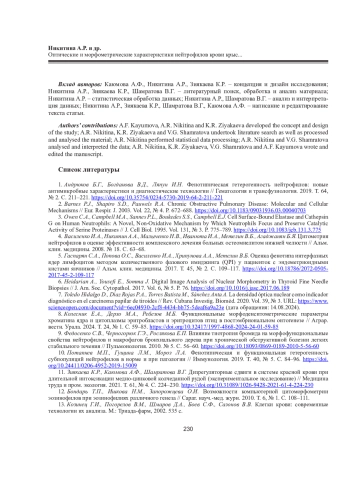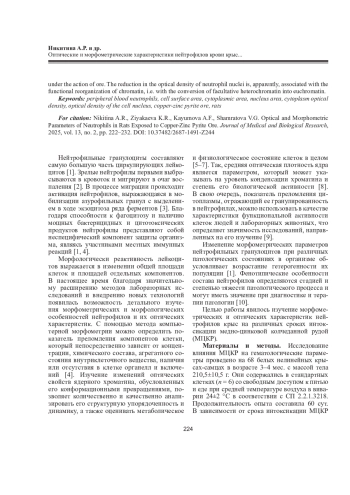Статья: ОПТИЧЕСКИЕ И МОРФОМЕТРИЧЕСКИЕ ХАРАКТЕРИСТИКИ НЕЙТРОФИЛОВ КРОВИ КРЫС В УСЛОВИЯХ ВОЗДЕЙСТВИЯ МЕДНО-ЦИНКОВОЙ КОЛЧЕДАННОЙ РУДЫ (2025)