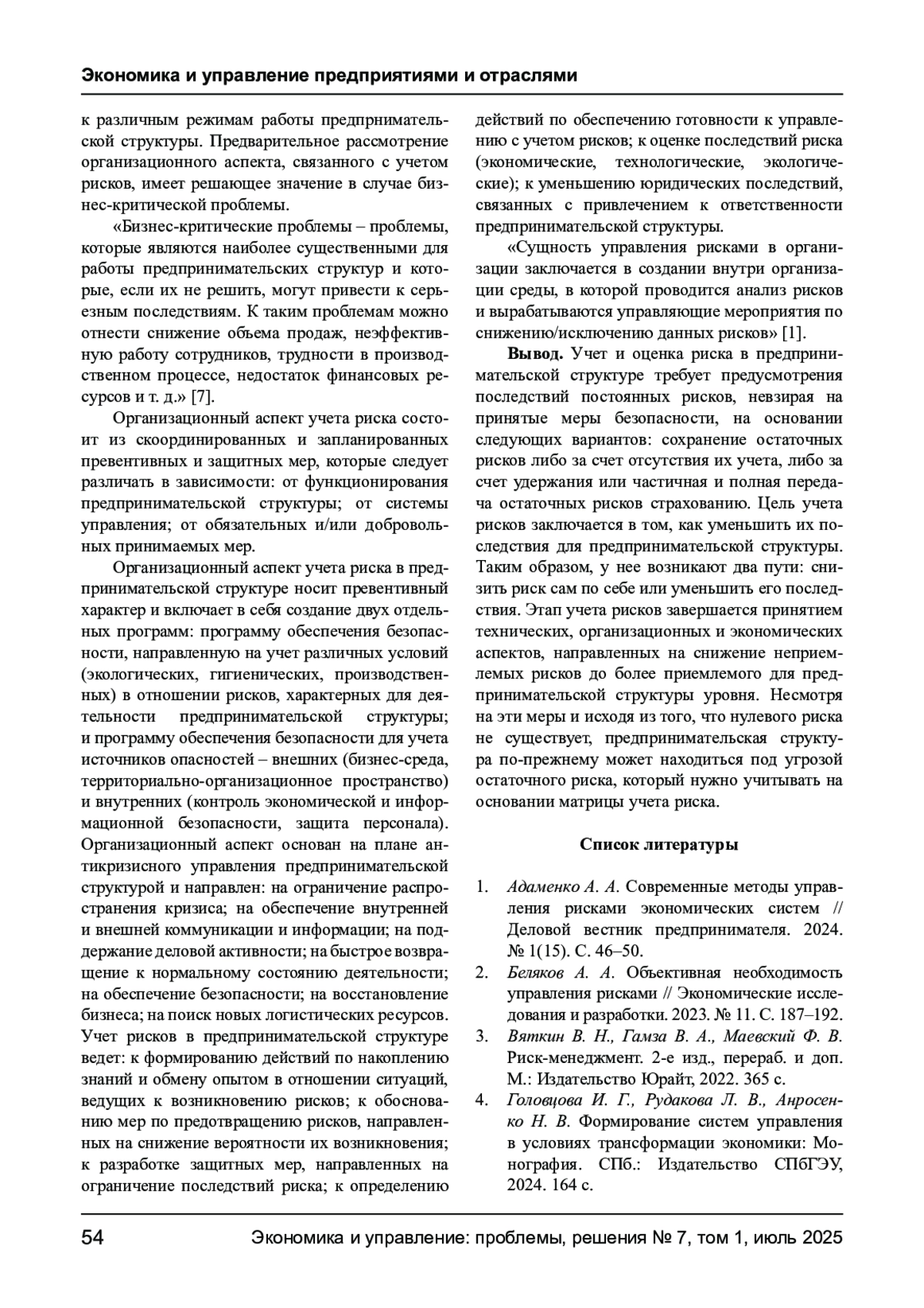 1. Адаменко А. А. Современные методы управления рисками экономических систем // Деловой вестник предпринимателя. 2024. № 1(15). С. 46-50. EDN: ZUYGQV