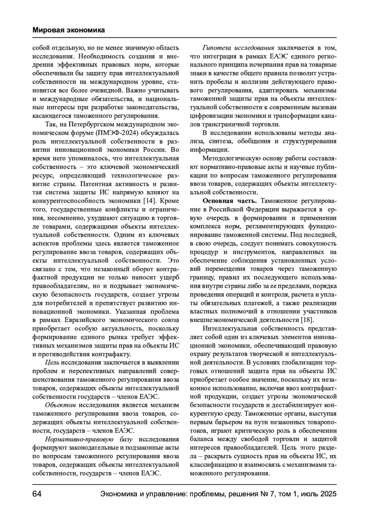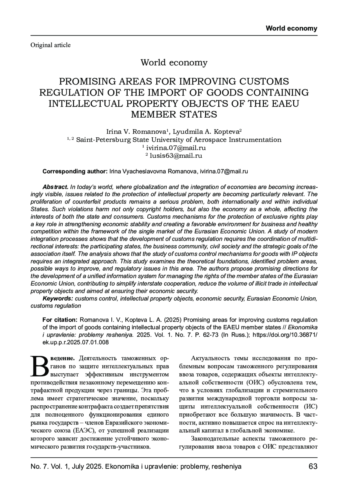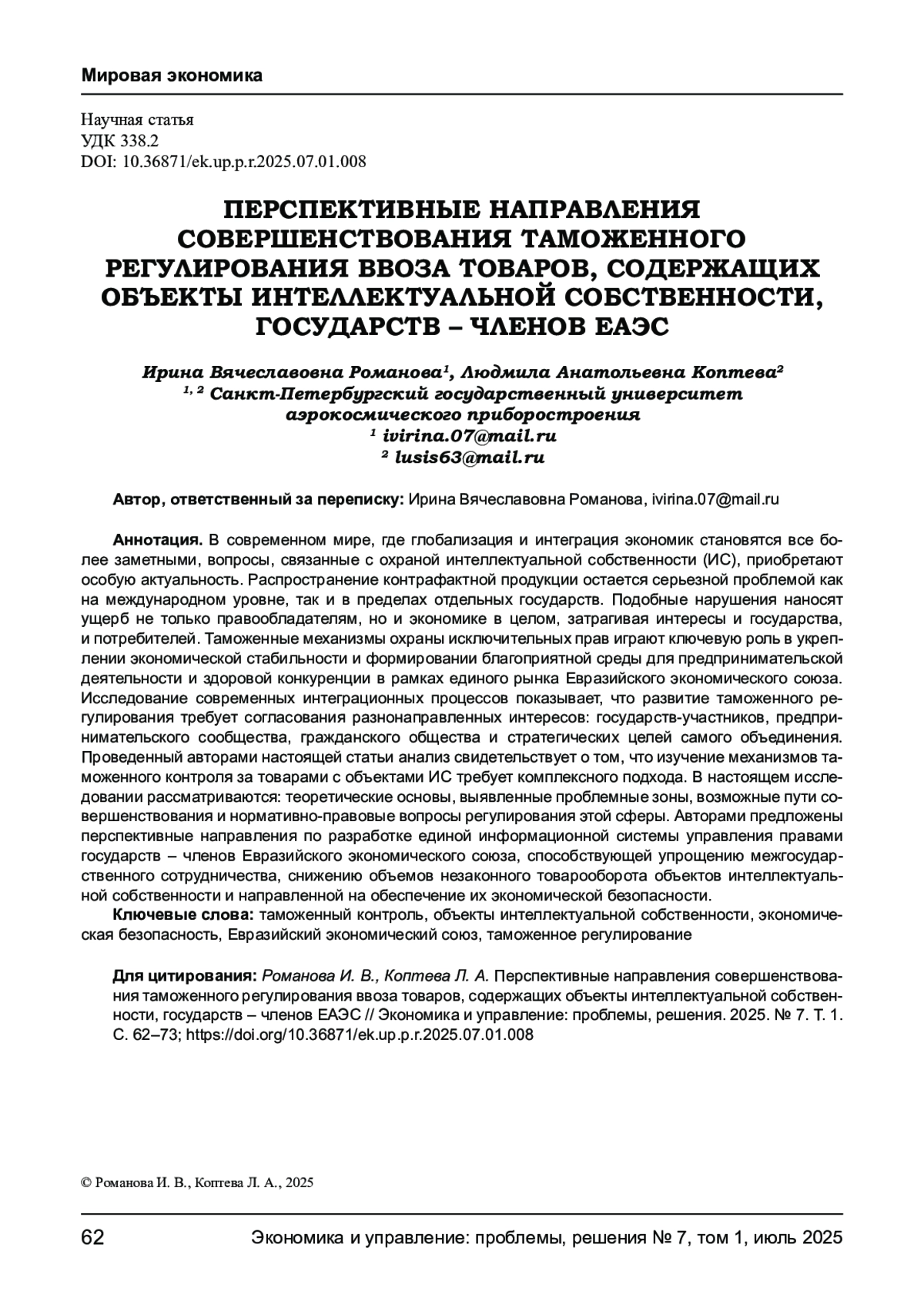 В современном мире, где глобализация и интеграция экономик становятся все более заметными, вопросы, связанные с охраной интеллектуальной собственности (ИС), приобретают особую актуальность. Распространение контрафактной продукции остается серьезной проблемой как на международном уровне, так и в пределах отдельных государств. Подобные нарушения наносят ущерб не только правообладателям, но и экономике в целом, затрагивая интересы и государства, и потребителей. Таможенные механизмы охраны исключительных прав играют ключевую роль в укреплении экономической стабильности и формировании благоприятной среды для предпринимательской деятельности и здоровой конкуренции в рамках единого рынка Евразийского экономического союза. Исследование современных интеграционных процессов показывает, что развитие таможенного регулирования требует согласования разнонаправленных интересов: государств-участников, предпринимательского сообщества, гражданского общества и стратегических целей самого объединения. Проведенный авторами настоящей статьи анализ свидетельствует о том, что изучение механизмов таможенного контроля за товарами с объектами ИС требует комплексного подхода. В настоящем исследовании рассматриваются: теоретические основы, выявленные проблемные зоны, возможные пути совершенствования и нормативно-правовые вопросы регулирования этой сферы. Авторами предложены перспективные направления по разработке единой информационной системы управления правами государств - членов Евразийского экономического союза, способствующей упрощению межгосударственного сотрудничества, снижению объемов незаконного товарооборота объектов интеллектуальной собственности и направленной на обеспечение их экономической безопасности.