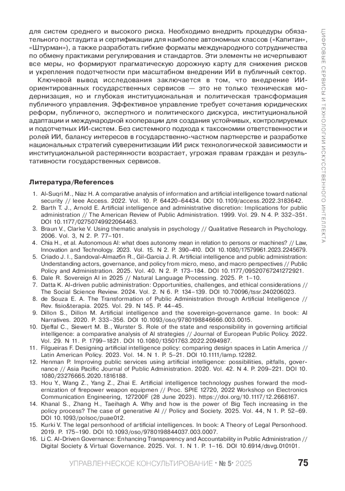 5. Criado J. I., Sandoval-Almazбn R., Gil-Garcia J. R. Artificial intelligence and public administration: Understanding actors, governance, and policy from micro, meso, and macro perspectives // Public Policy and Administration. 2025. Vol. 40. N 2. P. 173-184. https://doi.org/10.1177/09520767241272921.