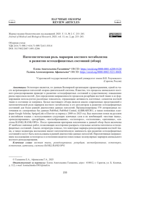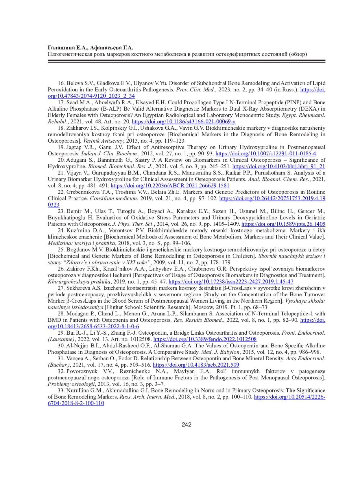 46. Астрейко М.О. Роль маркеров регуляции остеокластогенеза при остеопорозе // Бюл. Сев. гос. мед. ун-та. 2020. No 1. С. 225-226. EDN: JIAJTJ