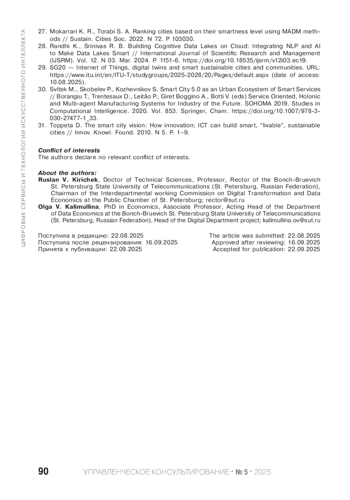 30. Svítek M., Skobelev P., Kozhevnikov S. Smart City 5.0 as an Urban Ecosystem of Smart Services. In: Borangiu, T., Trentesaux, D., Leitão, P., Giret Boggino, A., Botti, V. (eds) Service Oriented, Holonic and Multi-agent Manufacturing Systems for Industry of the Future. SOHOMA 2019. Studies in Computational Intelligence. 2020. Vol. 853. Springer, Cham. https://doi.org/10.1007/978-3-030-27477-1_33