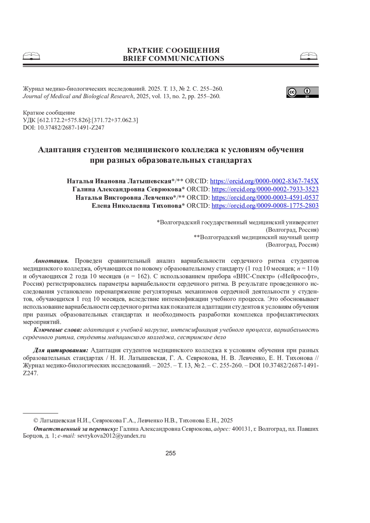 Проведен сравнительный анализ вариабельности сердечного ритма студентов медицинского колледжа, обучающихся по новому образовательному стандарту (1 год 10 месяцев; n = 110) и обучающихся 2 года 10 месяцев (n = 162). С использованием прибора «ВНС-Спектр» («Нейрософт», Россия) регистрировались параметры вариабельности сердечного ритма. В результате проведенного исследования установлено перенапряжение регуляторных механизмов сердечной деятельности у студентов, обучающихся 1 год 10 месяцев, вследствие интенсификации учебного процесса. Это обосновывает использование вариабельности сердечного ритма как показателя адаптации студентов к условиям обучения при разных образовательных стандартах и необходимость разработки комплекса профилактических мероприятий.