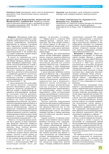 4. Дрововозова Т.И., Кириленко А.А. Совершенствование технического подхода к управлению процессом локальной очистки дренажного стока с орошаемых земель // Мелиорация и гидротехника. 2023. Т. 13. № 2. С. 94-108.