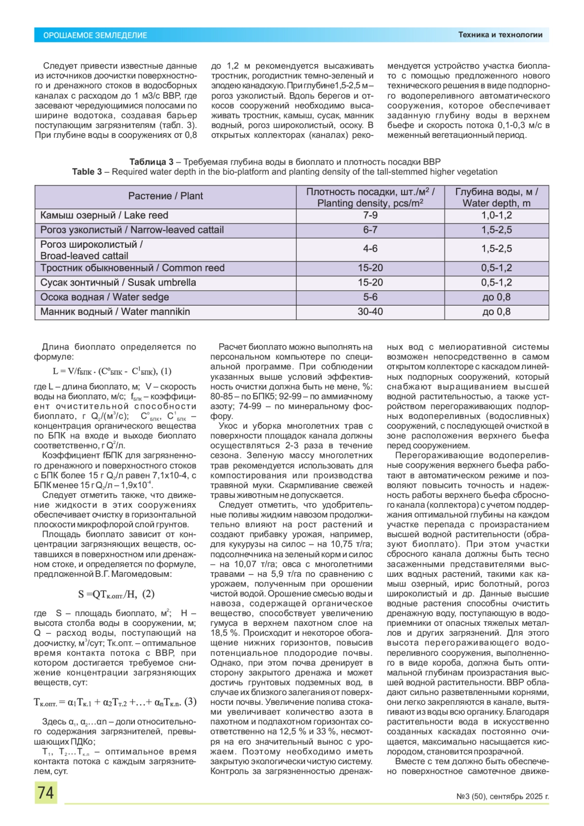 В условиях нарастающего дефицита водных ресурсов дополнительным водным источником могут служить маломинерализованные дренажносбросные воды. Объект исследования расположен на мелиоративной системе «Восход» у деревни Ходоровка Горецкого района Могилевской области, Беларусь. Материалы и методы. Рассмотрено устройство, согласно которому, на сбросных каналах рекомендуется расположение строительства по длине его каскада каналовбиопрудов, предназначенных для доочистки загрязненных поверхностного и дренажного стоков, секции каналабиопруда с подпорными автоматическими сооружениями для подержания заданного уровня воды в верхнем бьефе. Результаты и выводы. При заданной глубине воды в сооружениях рекомендуется высаживать высокорослую высшую водную растительность, которая обладает способностью поглощать загрязняющие вещества и может поддерживать заданный уровень воды в сооружениях от 0,5 до 1,5 м, в зависимости от вида культивируемой водной растительности. Строительство каскада каналов таких сооружений на практике обеспечит соответствующие аккумулирующие емкости воды с отстоем и выпадением химических веществ в створе непосредственно сооружения (ниже отметки порога сооружения) при максимально подпертым горизонтом уровня сбрасываемой дренажной воды, исходя из условий работы дренажной системы, создаваемой при поливе и осушения, до и после окончания. При заилении отдельных секций более 0,10-0,15 м необходимо проводить очистку каналов от отложений наилка, которая осуществляется экскаватором Э-304 с ремонтным ковшом. Для устройства сооружений данного типа при уклонах поверхности не менее 0,005 длина секций сооружений принимается от 10 до 40 м. Применение разработанной технологии позволит обеспечить экономический эффект за счет снижения затрат подачи воды на оросительную систему.