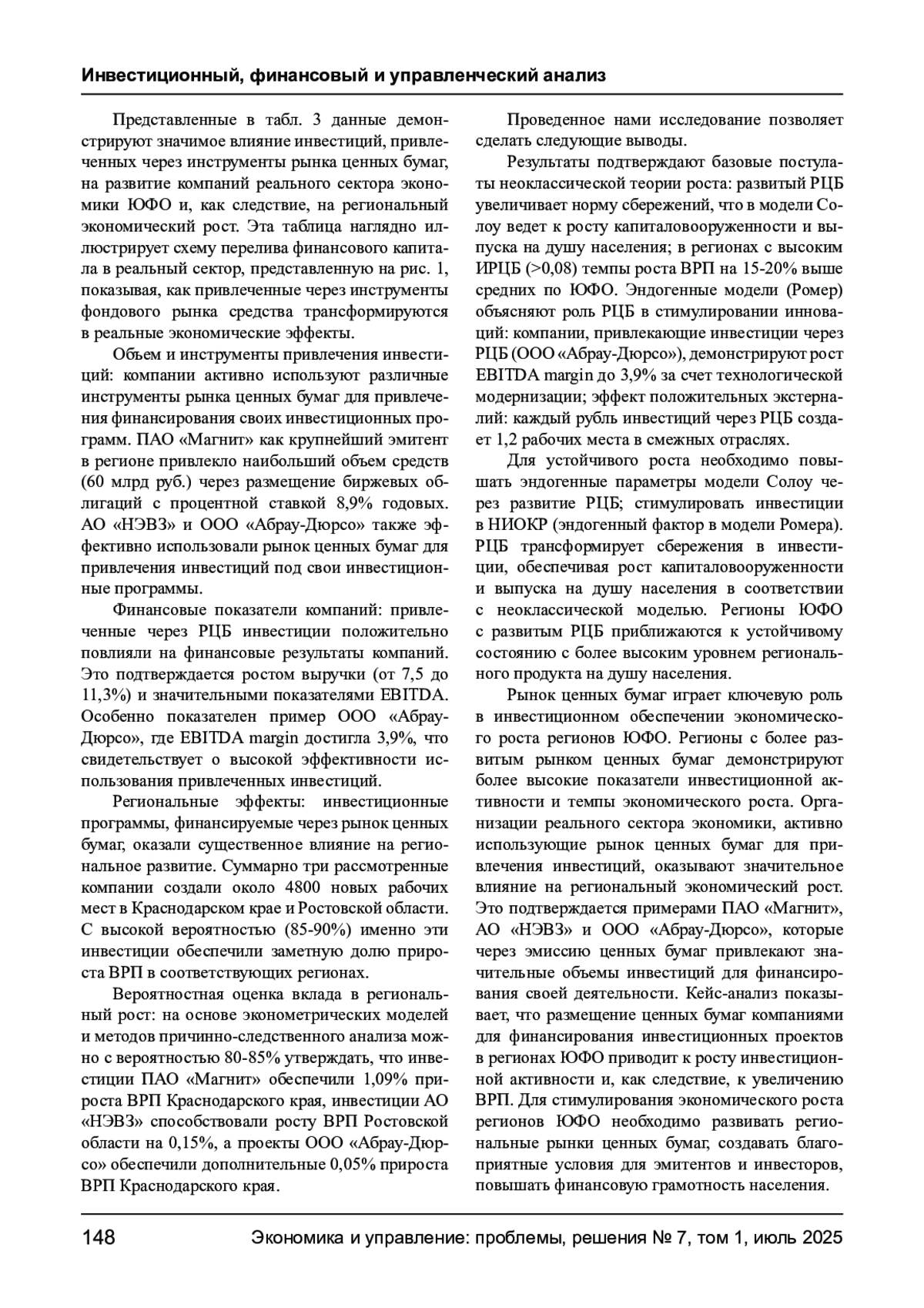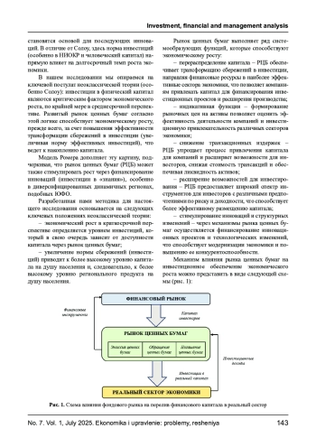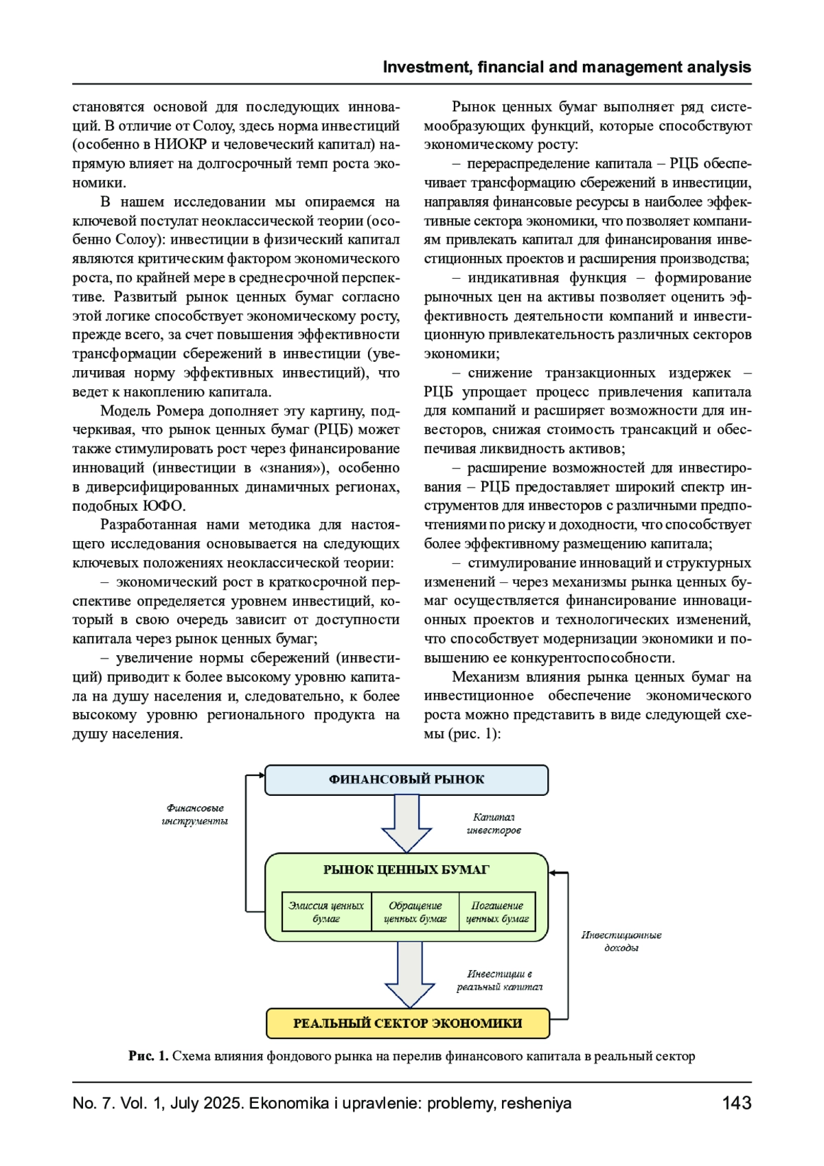 Актуальность исследования, проведенного в настоящей статье, обусловлена необходимостью поиска эффективных механизмов трансформации финансового капитала в реальные инвестиции для стимулирования устойчивого экономического развития территорий региона в условиях структурной трансформации хозяйственной системы. Авторами разработана и представлена методика оценки влияния рынка ценных бумаг на инвестиционное обеспечение экономического роста в Южном федеральном округе. На примере организаций реального сектора экономики Южного федерального округа проведен инвестиционный анализ влияния инвестиций в реальный капитал, привлеченных через рынок ценных бумаг, на региональное хозяйственное развитие. Разработанная методика основана на принципах неоклассической экономической теории с адаптацией для регионального уровня и включает оценку ключевых индикаторов инвестиционной активности и экономического роста.