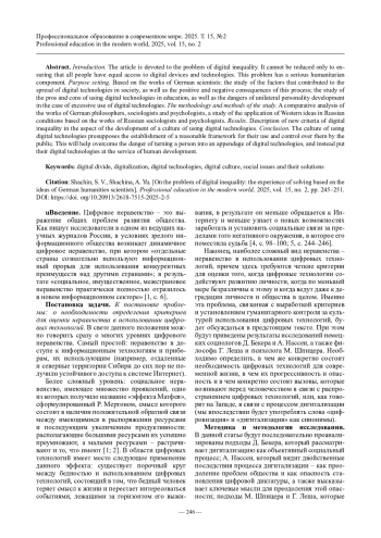 Введение. Статья посвящена проблеме цифрового неравенства. Она не может быть сведена только к обеспечению всем людям равного доступа к цифровым приборам и технологиям. Данная проблема имеет серьезную гуманитарную составляющую.