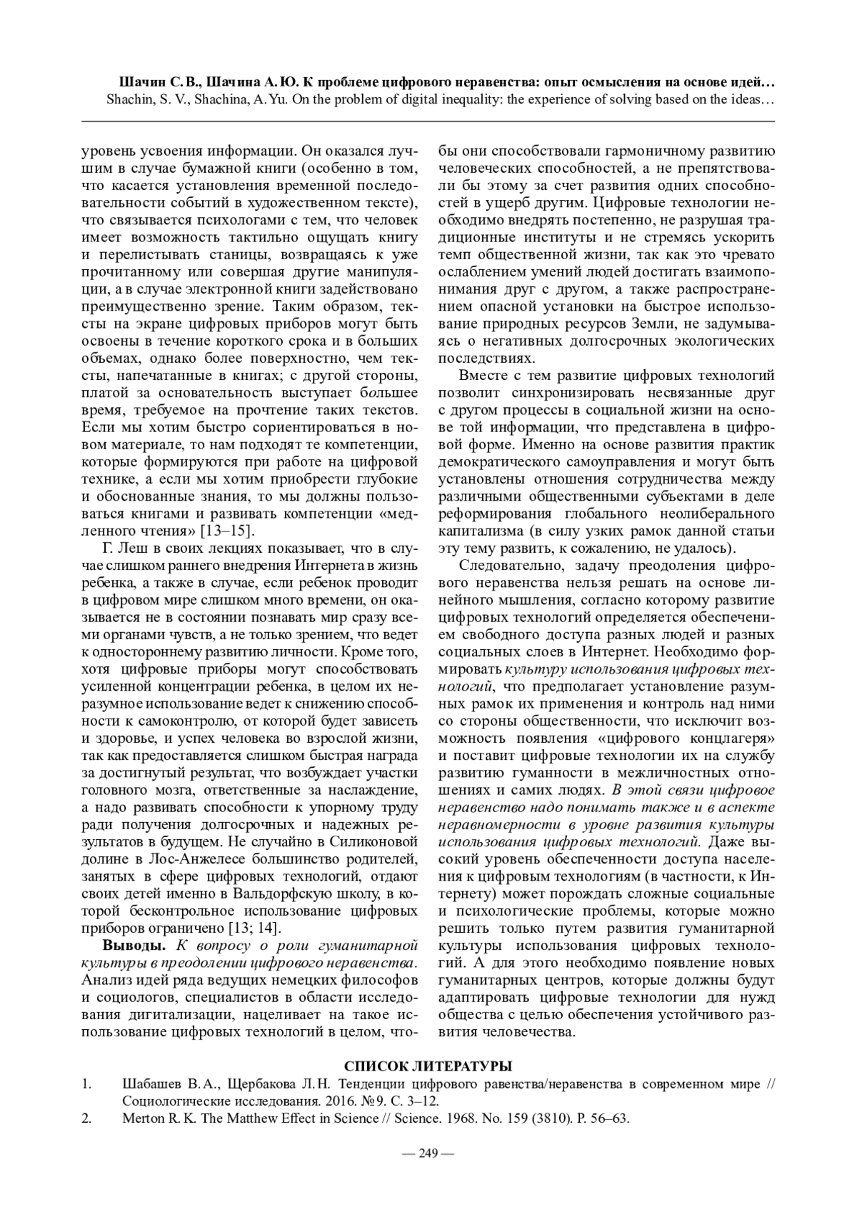 1. Шабашев В.А., Щербакова Л.Н. Тенденции цифрового равенства/неравенства в современном мире // Социологические исследования. 2016. № 9. С. 3-12.